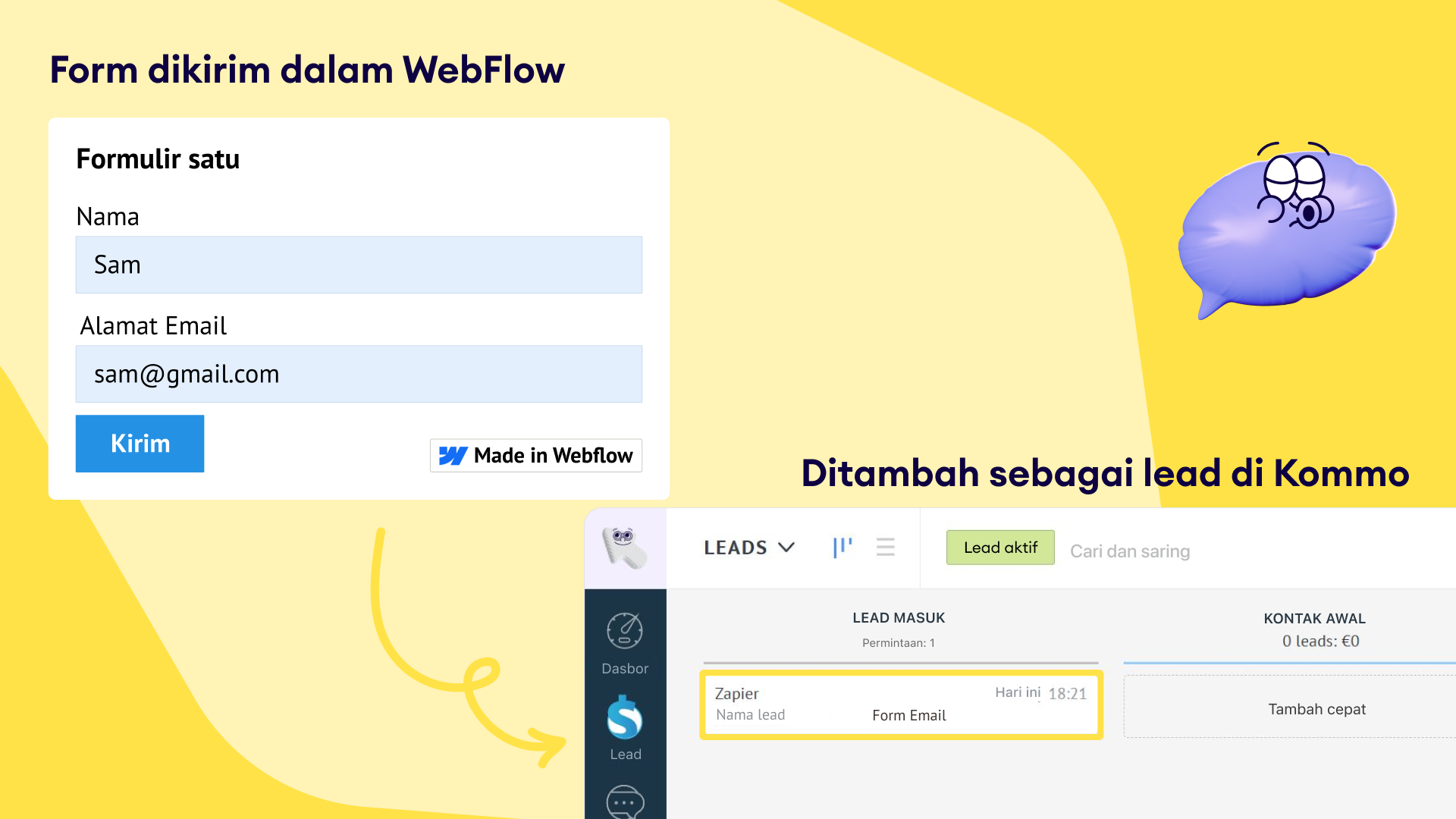Lewat Zapier, Webflow bukan hanya sekadar website, tapi mesin lead-generation yang canggih. Pengguna Kommo suka karena setiap form yang terkirim langsung masuk ke CRM, siap di-follow-up. Cepat, otomatis, dan dirancang agar tim sales bisa merespons instan tanpa pernah kehilangan leads.