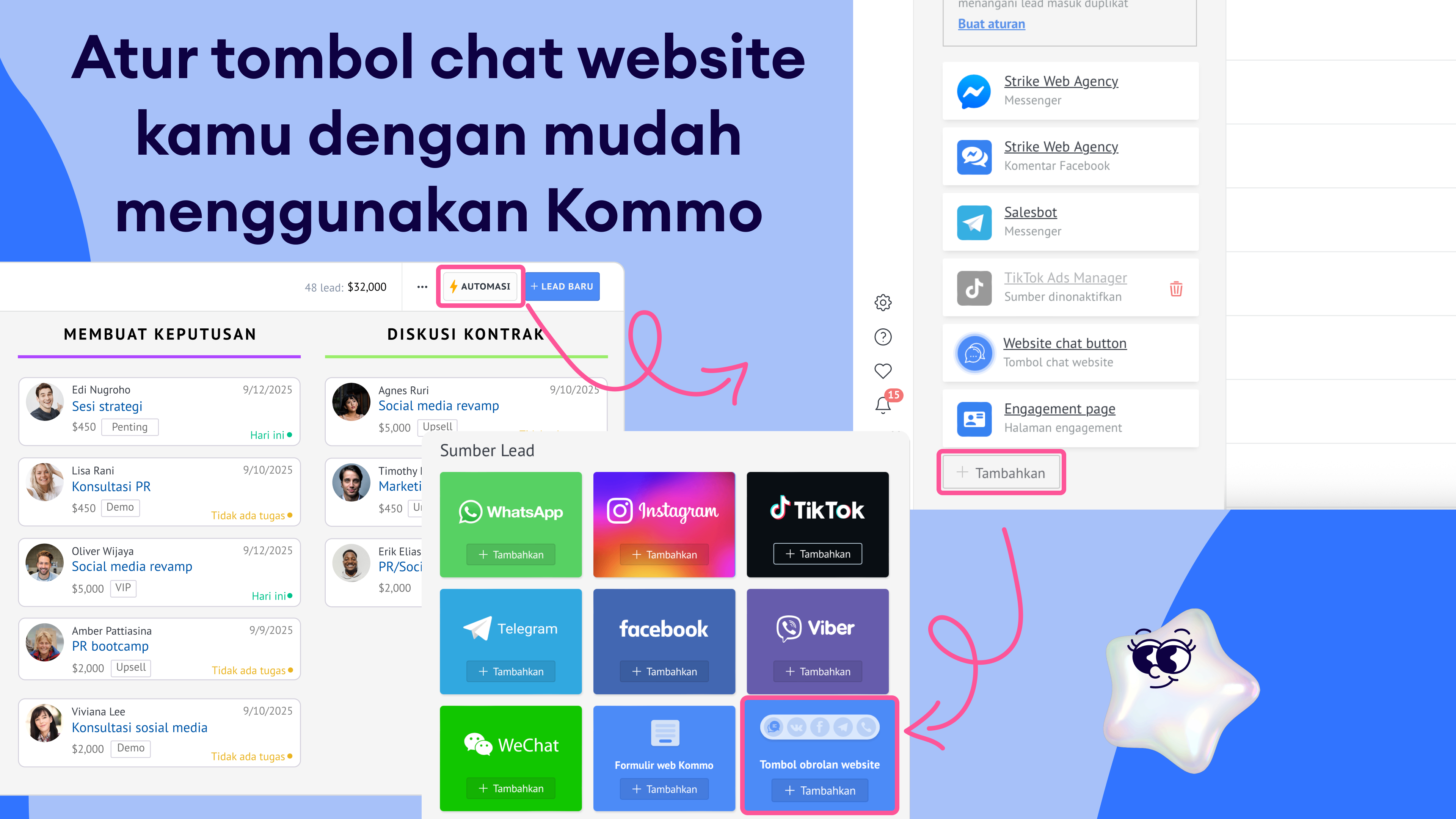 Dengan Website chat button dari Kommo, situs kamu berubah jadi alat powerful untuk menghasilkan leads. Semua percakapan terpusat di dalam multichannel CRM Kommo, di mana kamu bisa menggunakan visual pipeline, otomatisasi, dan follow-up untuk menutup deal lebih cepat. Tidak ada leads yang terlewat, dan tim sales maupun support tetap sinkron dengan sempurna.