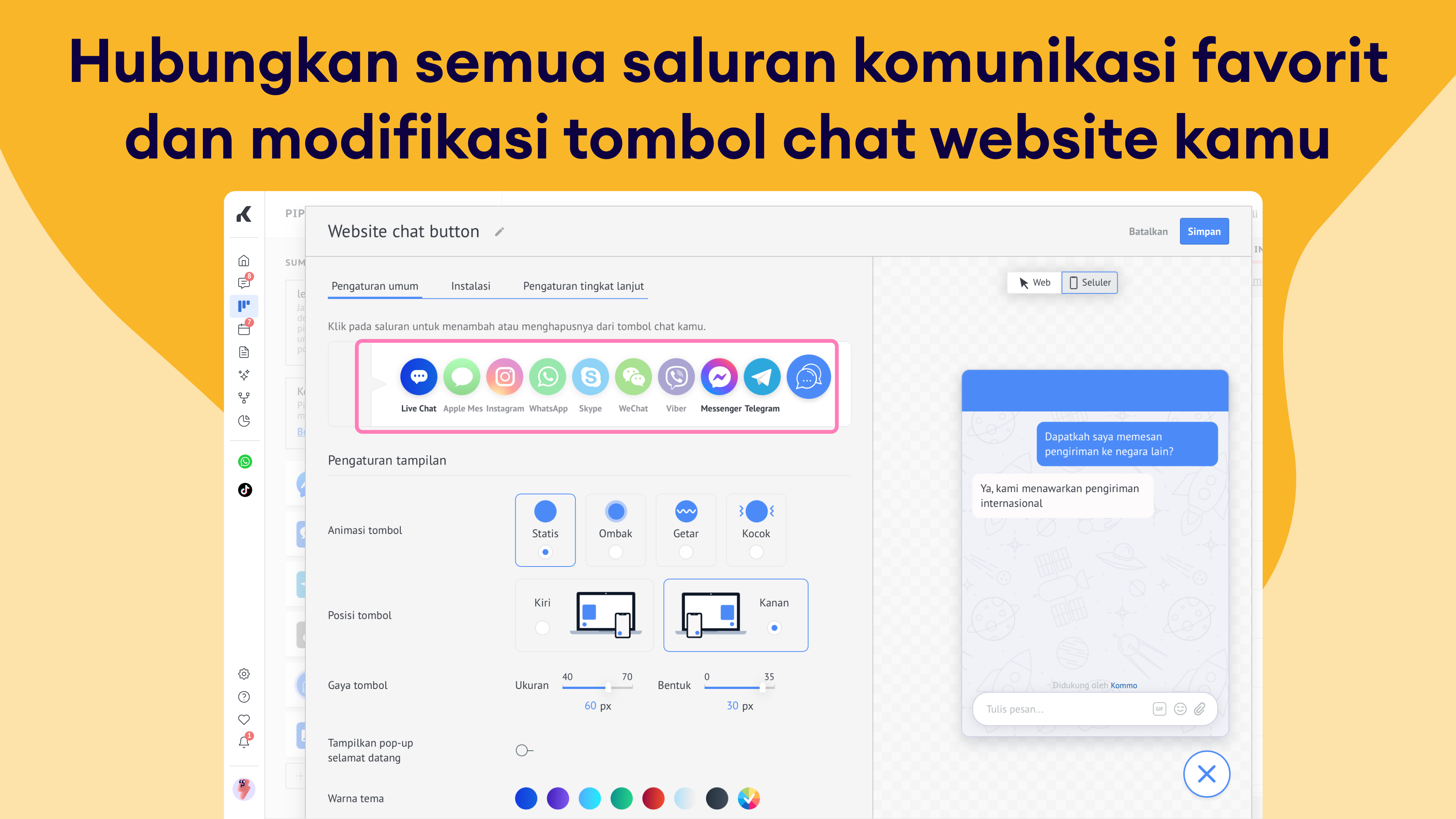Selesai, tombol chat kamu sudah aktif ⭐. Cek panduan setup kami untuk tahu lebih banyak tentang integrasi ini. Kamu juga bisa baca artikel detail kami tentang Website chat button.