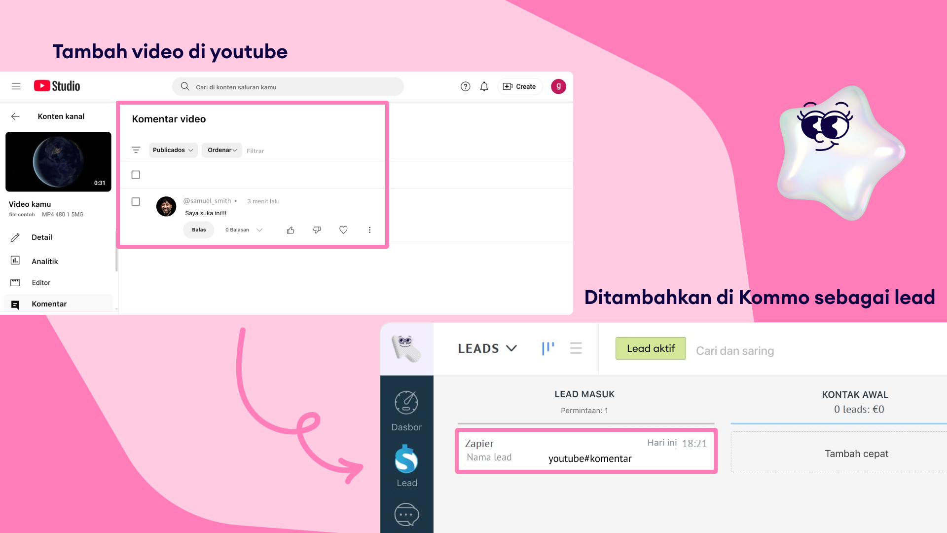 YouTube via Zapier menghubungkan engagement video langsung ke Kommo CRM kamu. Baik itu penonton yang berkomentar, memberi like, atau subscribe, kamu bisa langsung mengubah interaksi tersebut menjadi lead yang dapat dilacak, aktivitas, atau memicu tugas tindak lanjut. Ini adalah cara yang lebih pintar untuk menghubungkan strategi konten kamu dengan alur kerja sales dan marketing.