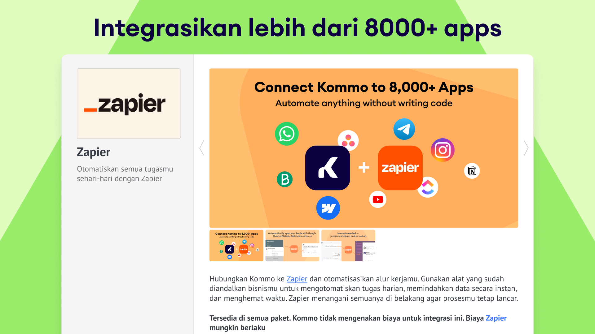 - Atur Zaps menggunakan template siap pakai atau custom triggers dan actions untuk mentransfer data secara mulus antara Kommo dan aplikasi kamu.