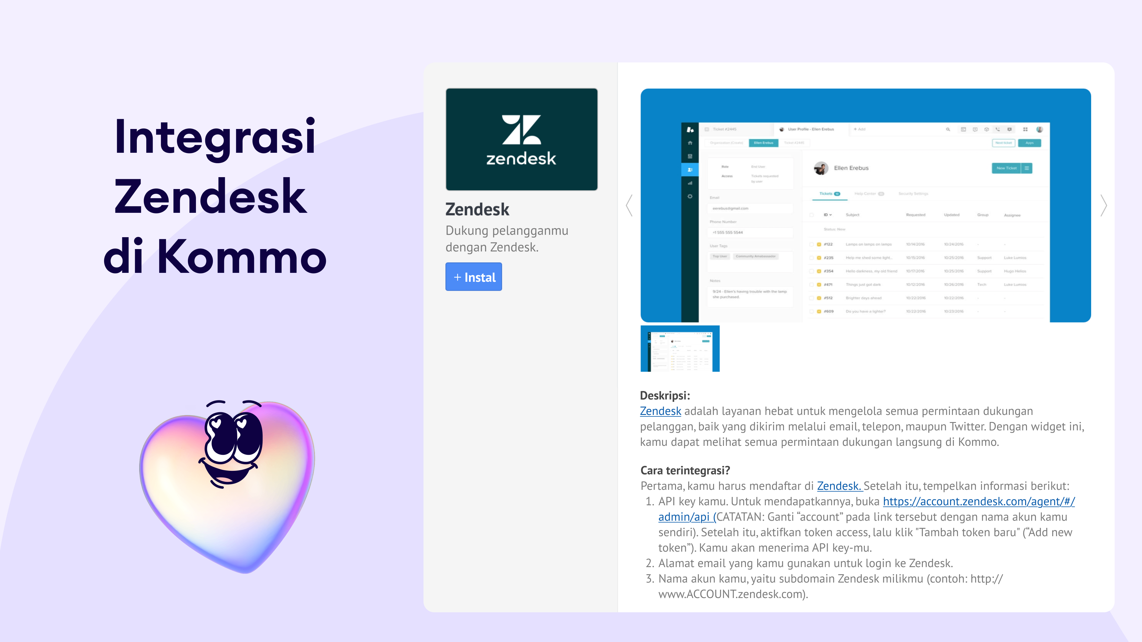 Untuk menghubungkan Zendesk ke Kommo, login ke akun Zendesk kamu dan install aplikasi Kommo dari Zendesk Marketplace. Lalu ikuti langkah berikut: