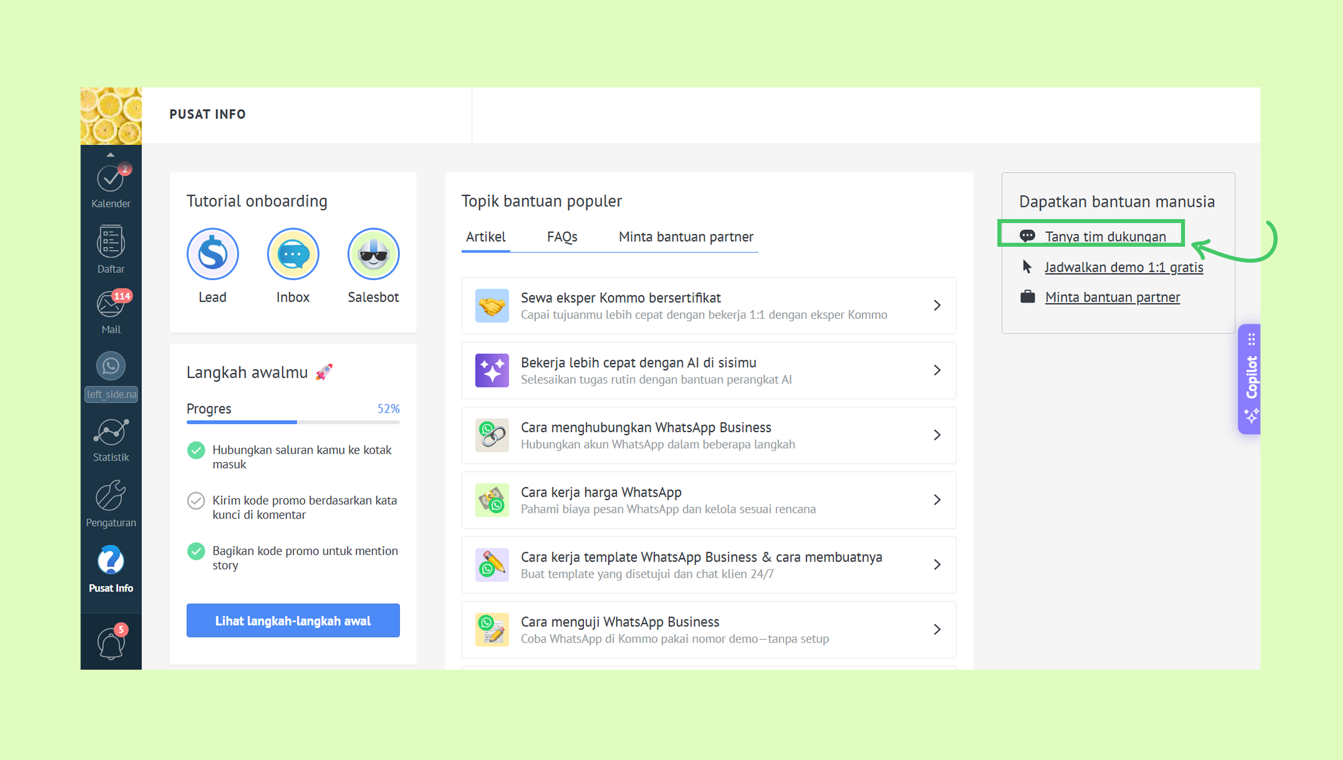 Jendela layanan pelanggan 24 jam – Setiap kali klien menghubungi, terbuka jendela 24 jam di mana kamu bisa membalas bebas tanpa template.