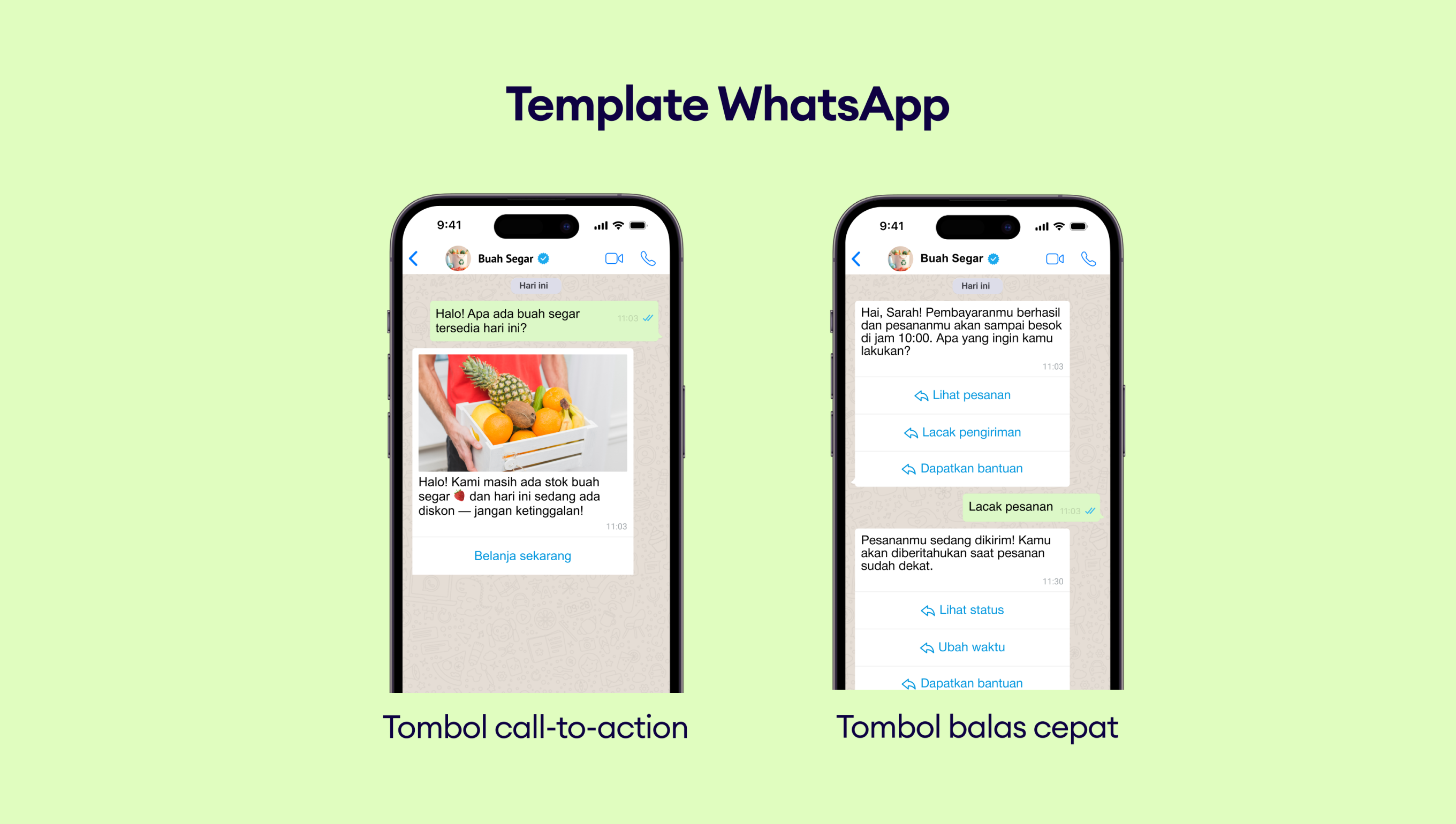 Template pesan WhatsApp merupakan template yang telah disetujui terlebih dahulu oleh Meta. Bisnis menggunakannya untuk memulai obrolan baru dengan klien atau melanjutkan percakapan yang sudah ada. Template ini adalah satu-satunya cara perusahaan bisa menghubungi klien terlebih dahulu, baik untuk mengirim pengingat, pembaruan, atau penawaran khusus.