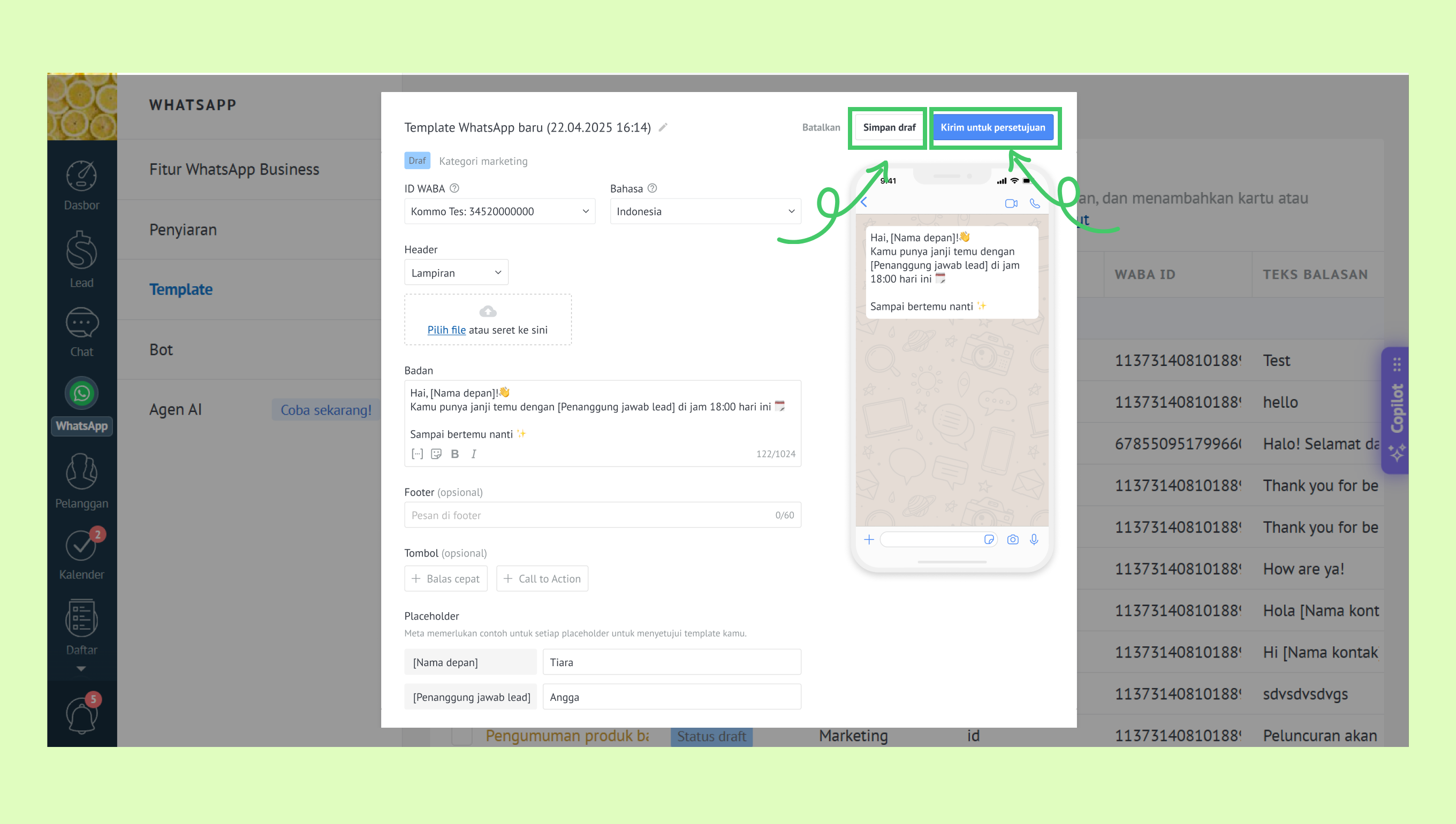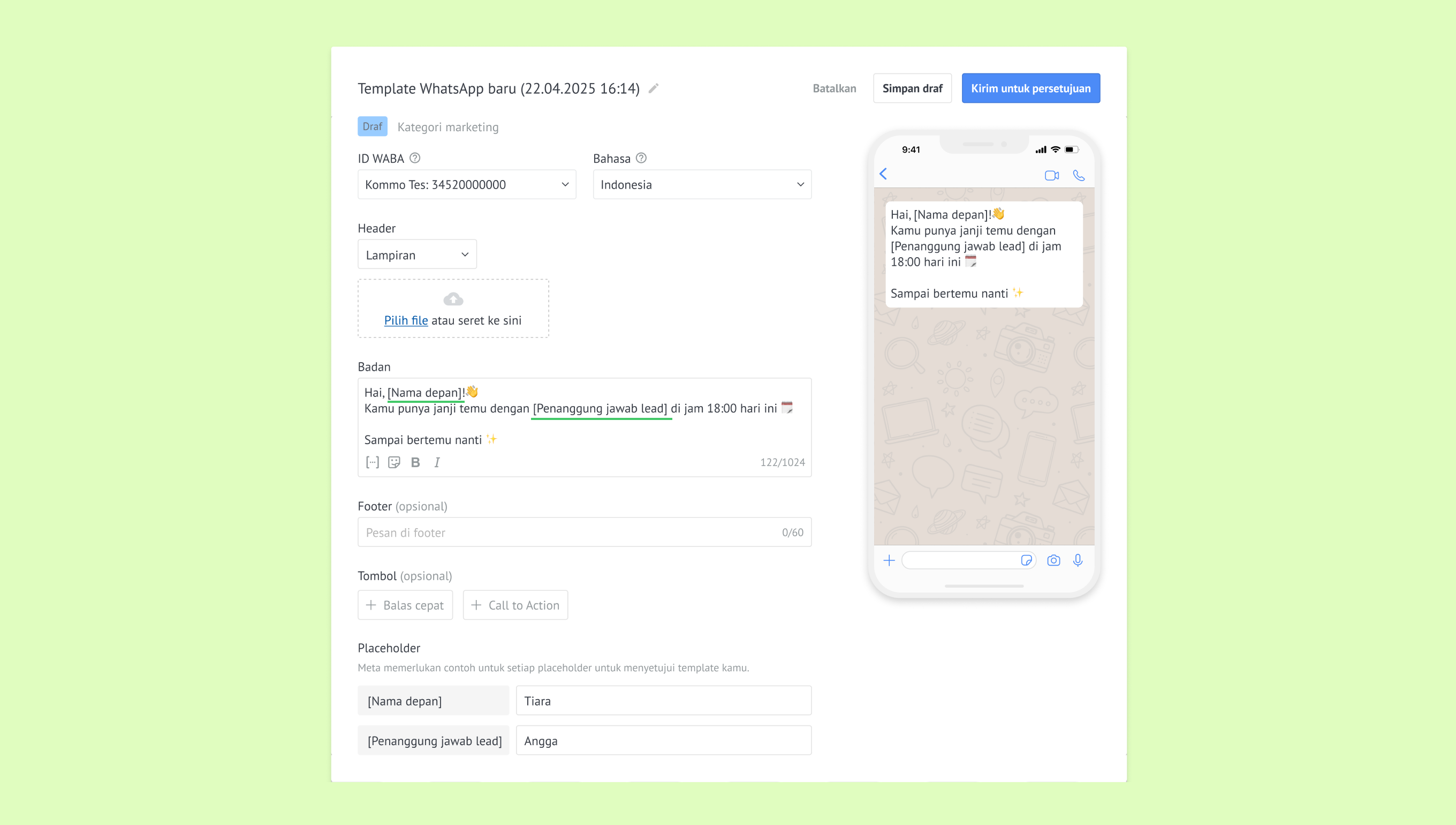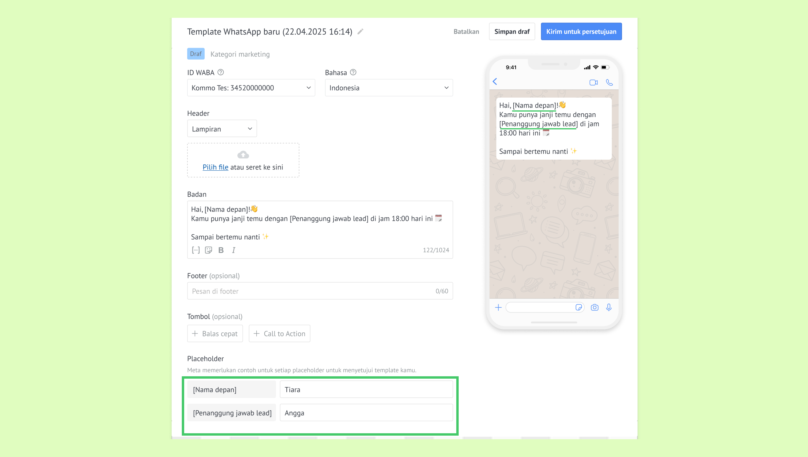 Di sisi kanan jendela Template WhatsApp baru, kamu akan melihat placeholders. Ini adalah variabel yang ditulis di dalam tanda kurung siku (misalnya, [Nama lead]). Placeholder otomatis mengambil data dari kartu lead, kontak, atau perusahaan untuk mempersonalisasi setiap pesan.