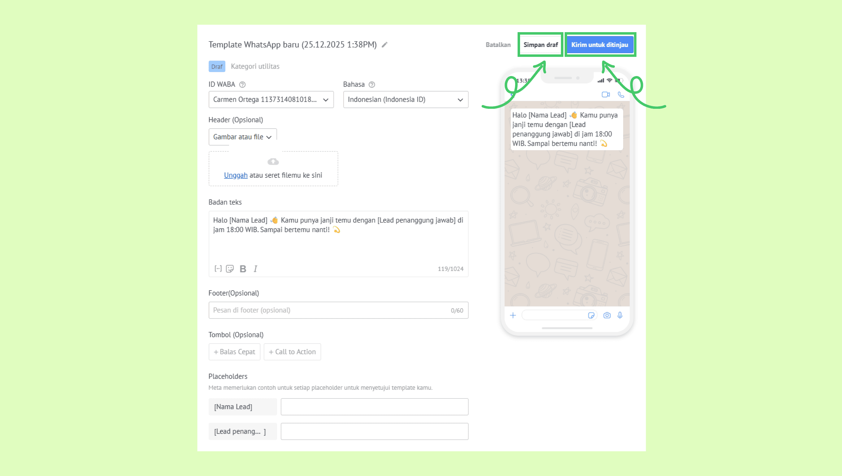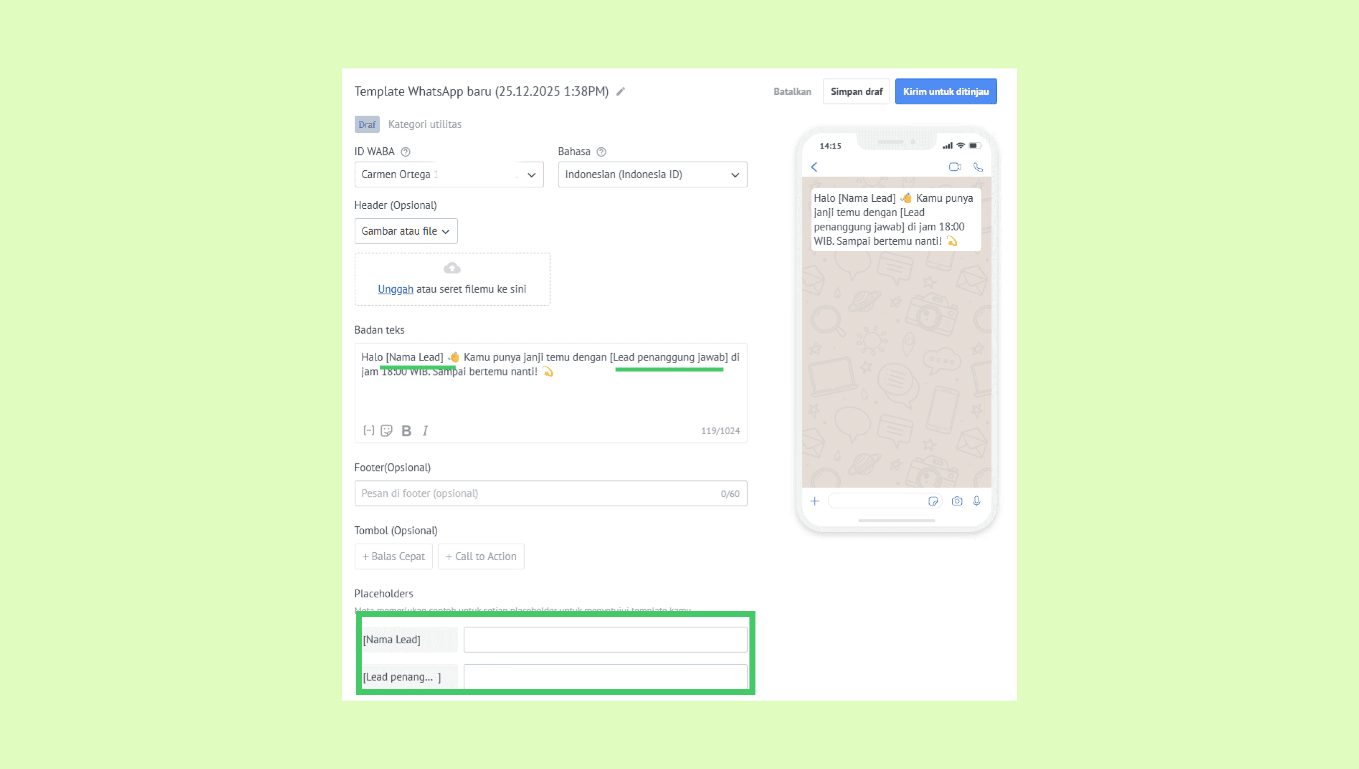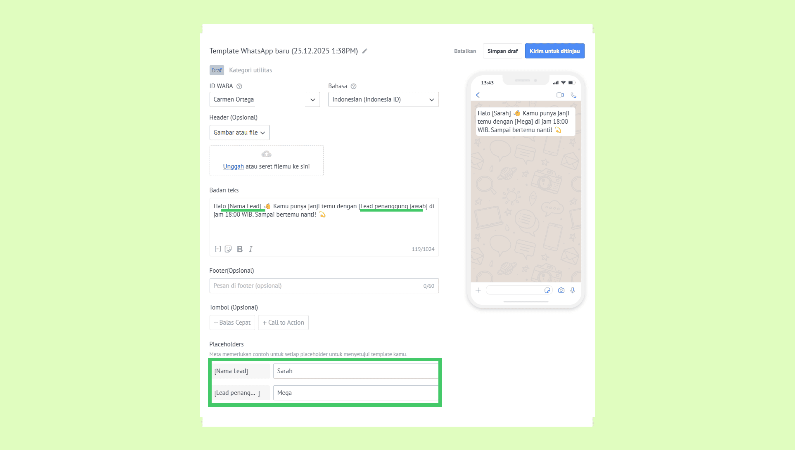 Di sisi kanan jendela Template WhatsApp baru, kamu akan melihat placeholders. Ini adalah variabel yang ditulis di dalam tanda kurung siku (misalnya, [Nama lead]). Placeholder otomatis mengambil data dari kartu lead, kontak, atau perusahaan untuk mempersonalisasi setiap pesan.