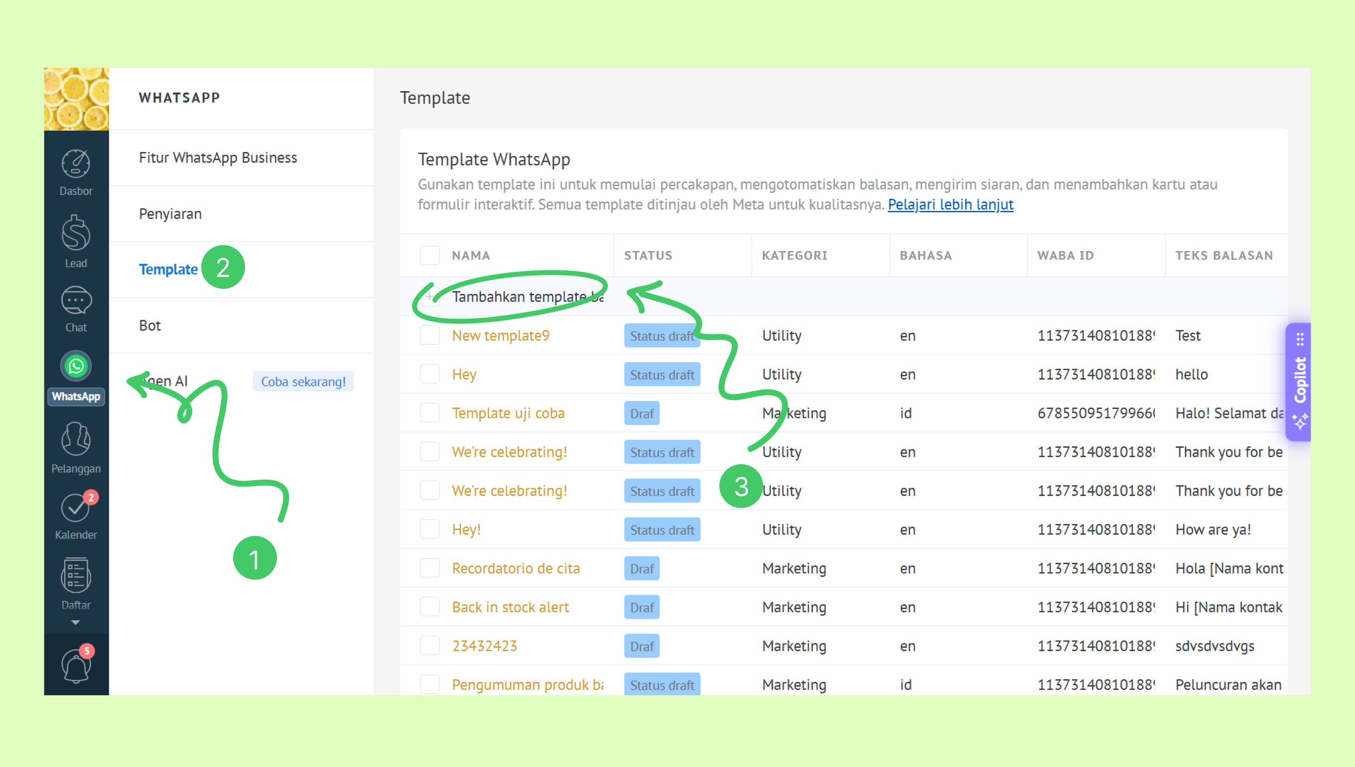 Buka WhatsApp (di menu kiri) > Template > Template WhatsApp template dan klik Tambahkan template baru.