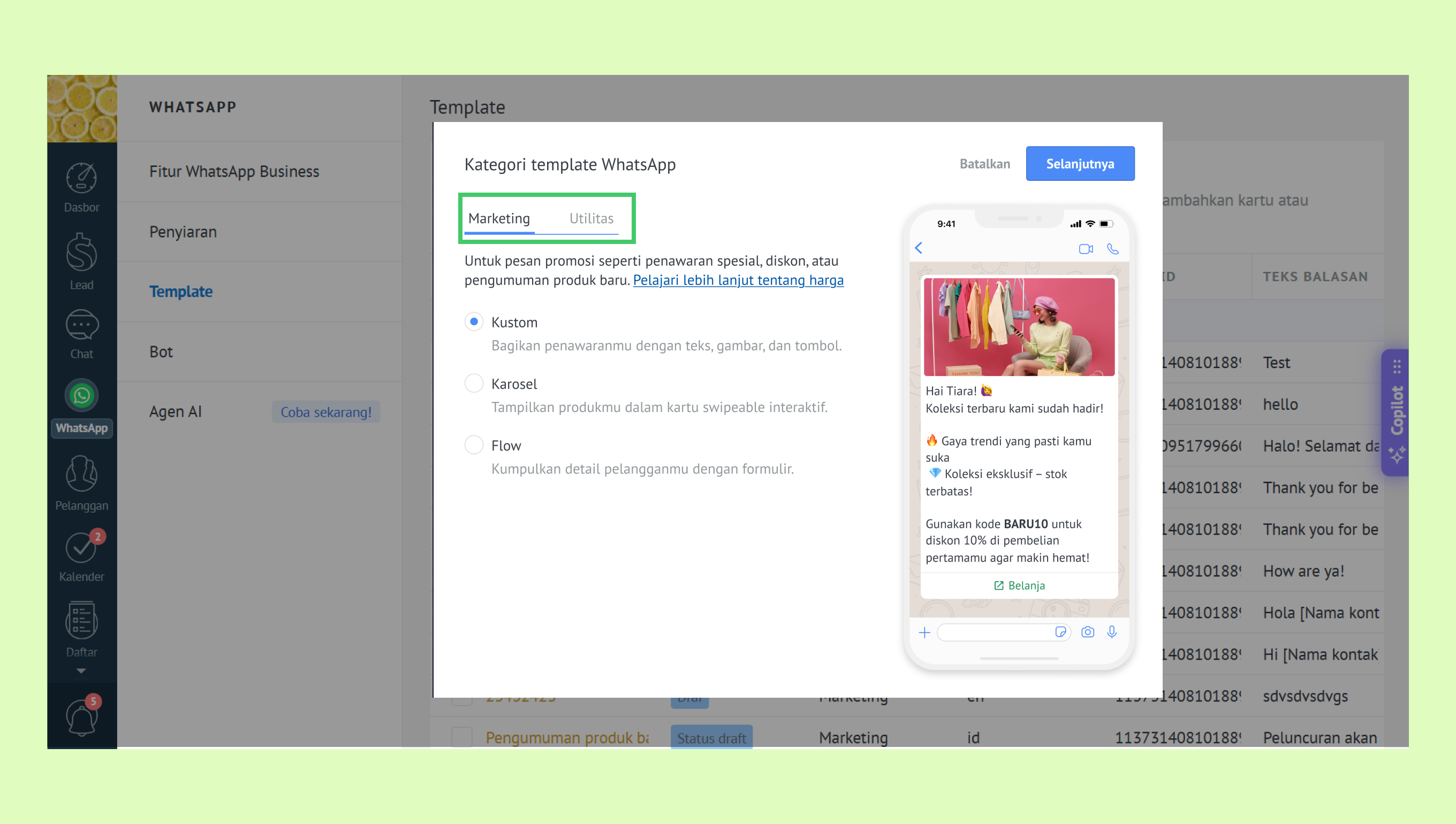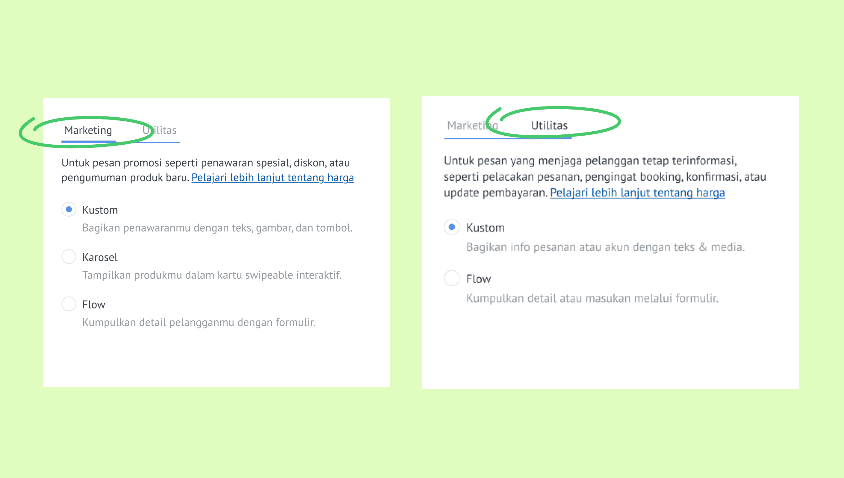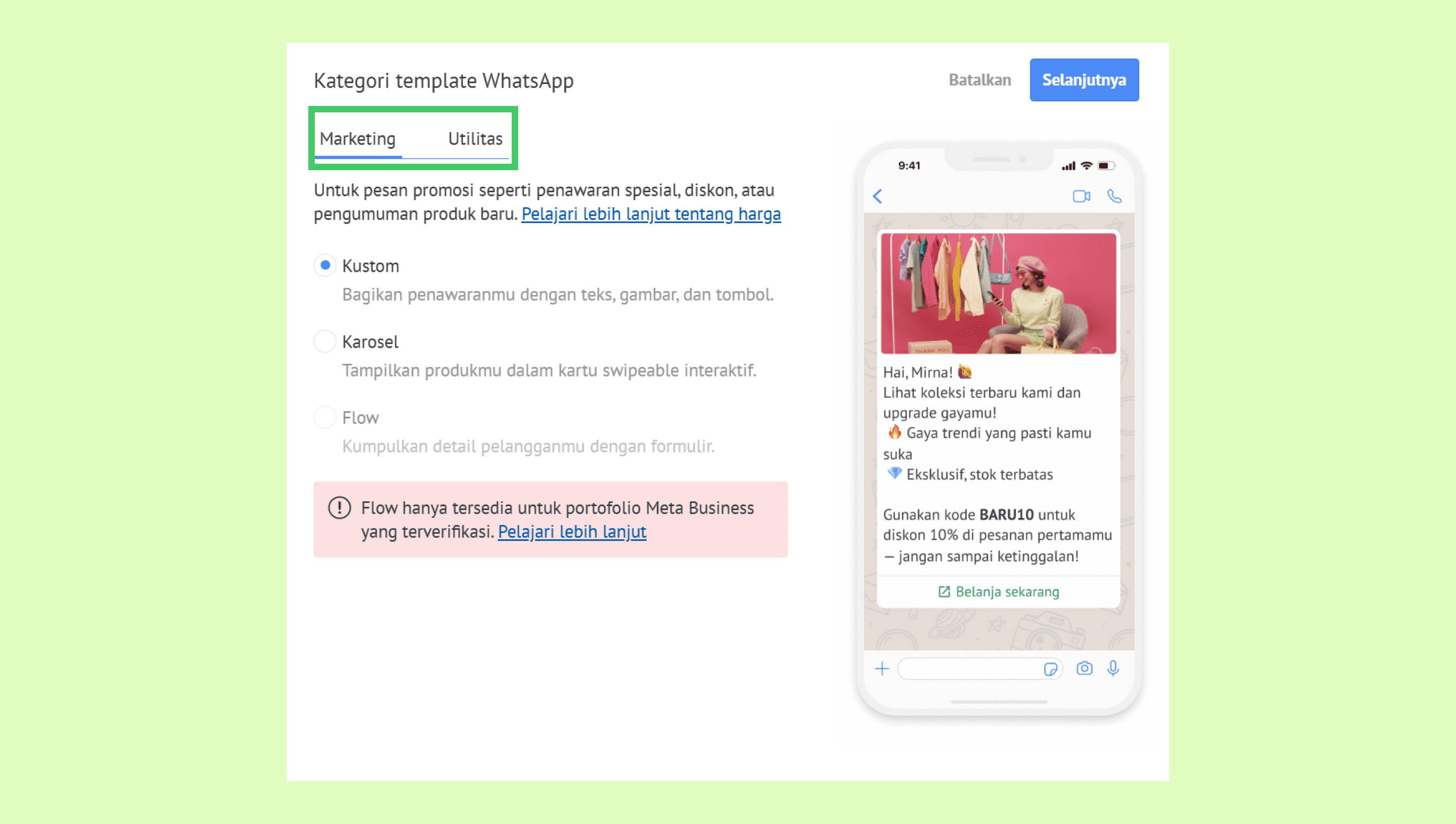 Catatan: Karosel hanya tersedia untuk Marketing. Flows membutuhkan akun WhatsApp Business (WABA) yang sudah terverifikasi. Pelajari lebih lanjut tentang template Flows di artikel kami.
