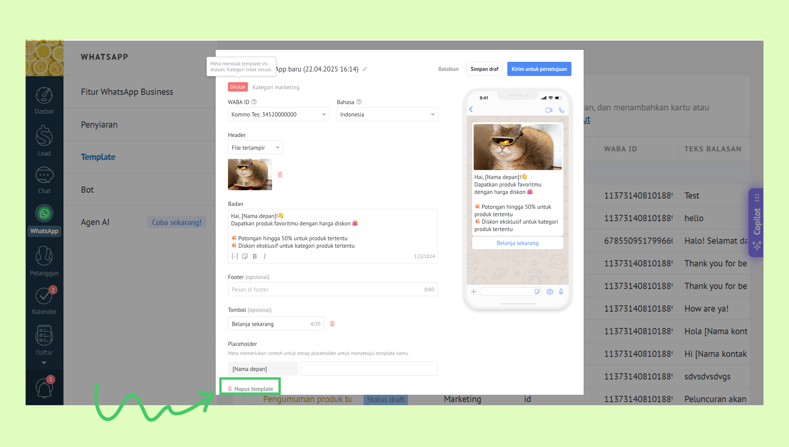 Kamu bisa mengedit template dan mengirim ulang untuk persetujuan dengan mengulangi proses, atau pilih hapus dengan klik Hapus template.