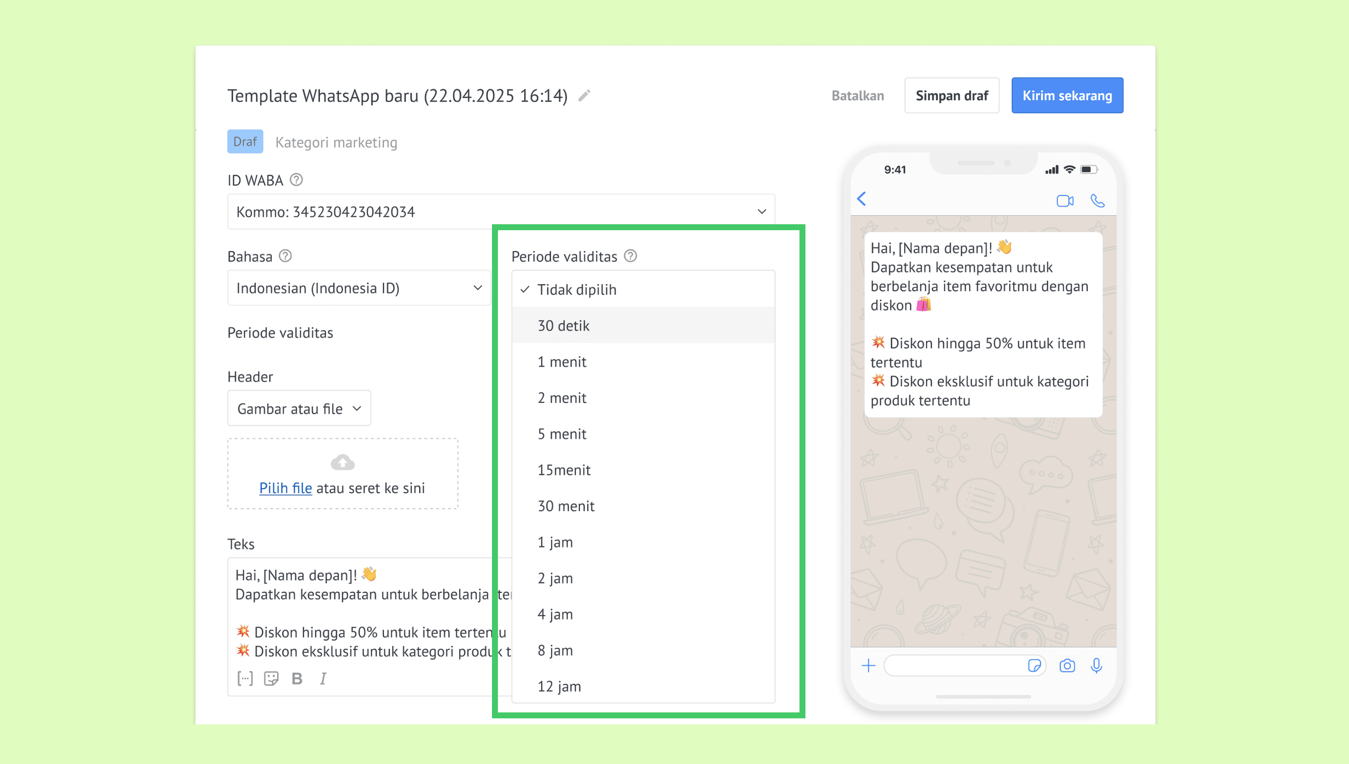 Untuk template marketing, periode validitas yang tersedia berkisar antara 12 jam hingga 30 hari.