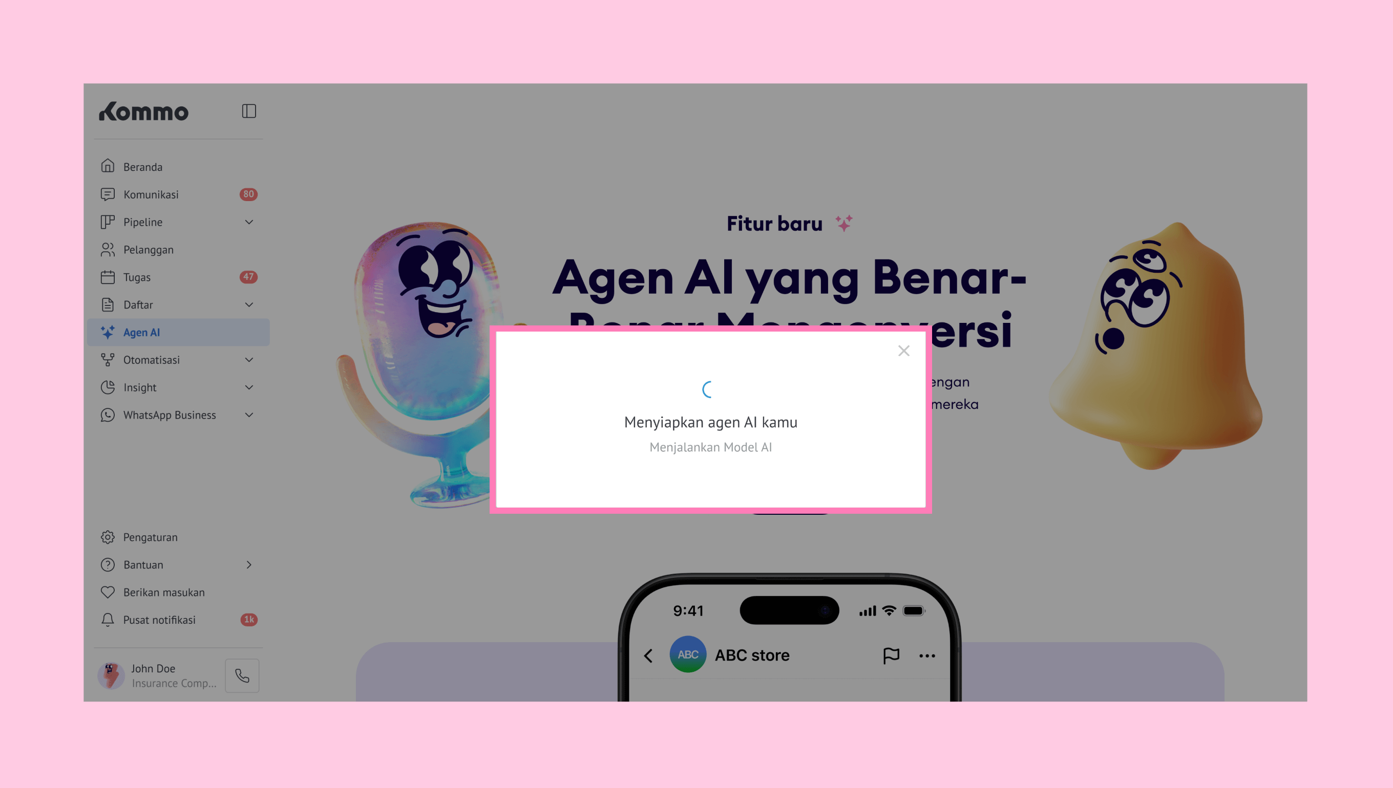 Alur pengaturan ini dirancang untuk membantu kamu membuat dan mencoba agen AI dengan konfigurasi minimal. Sistem akan otomatis membuat agen AI yang siap digunakan berdasarkan informasi yang kamu berikan saat onboarding (misalnya: industri, nama perusahaan, subdomain, dan lainnya).