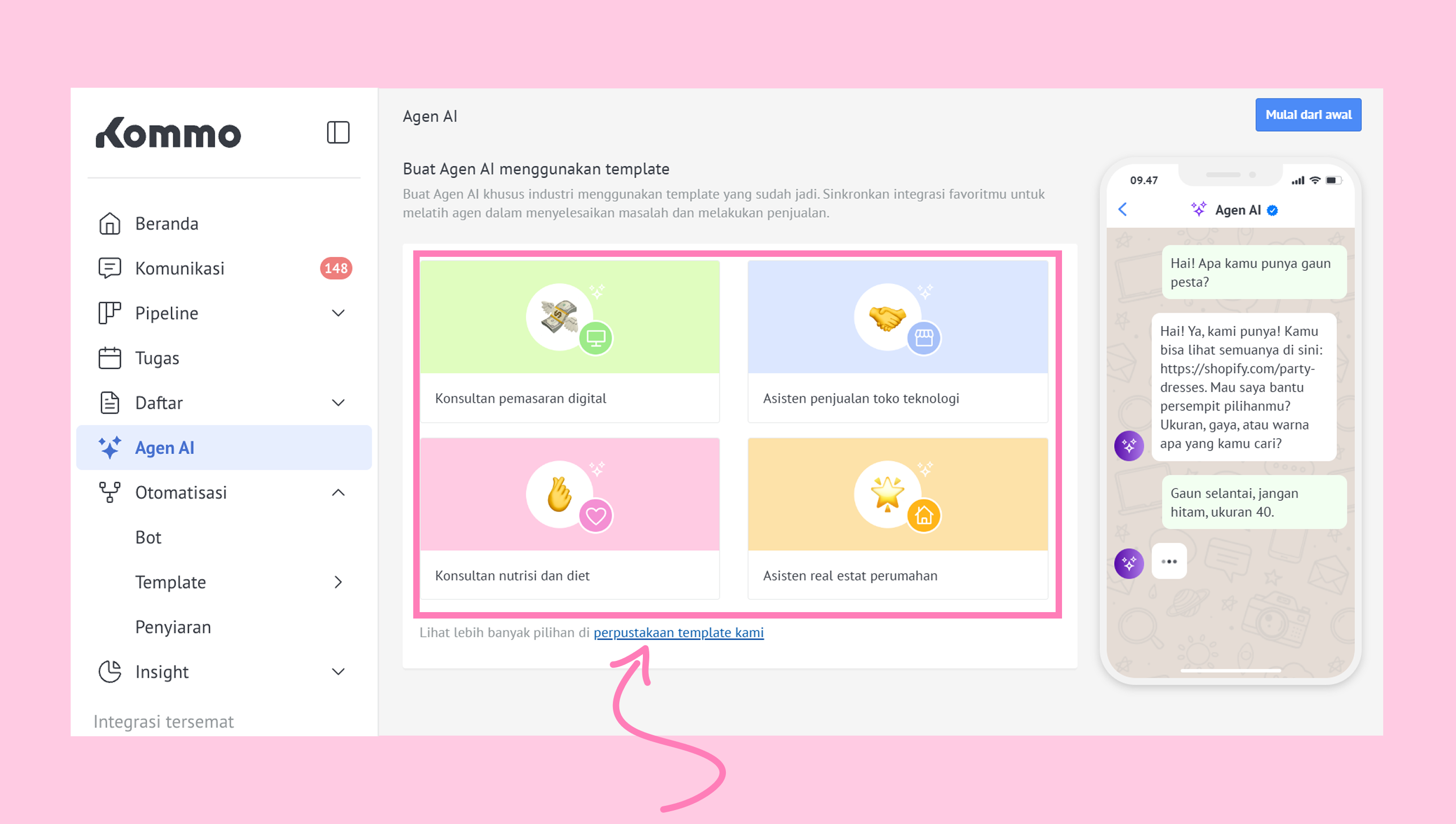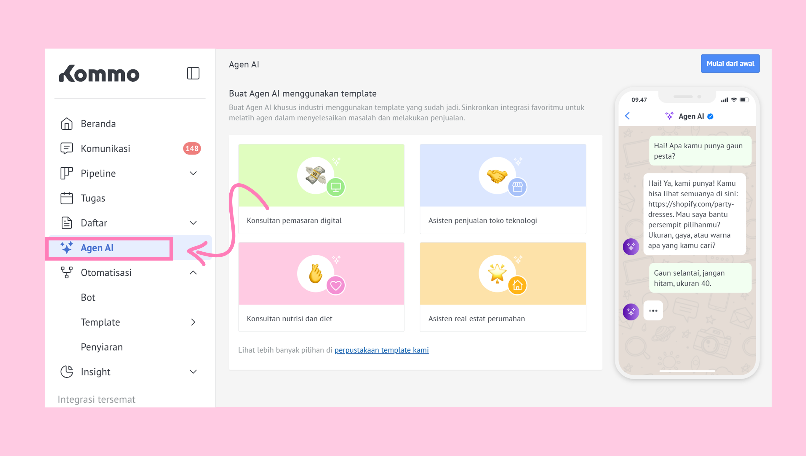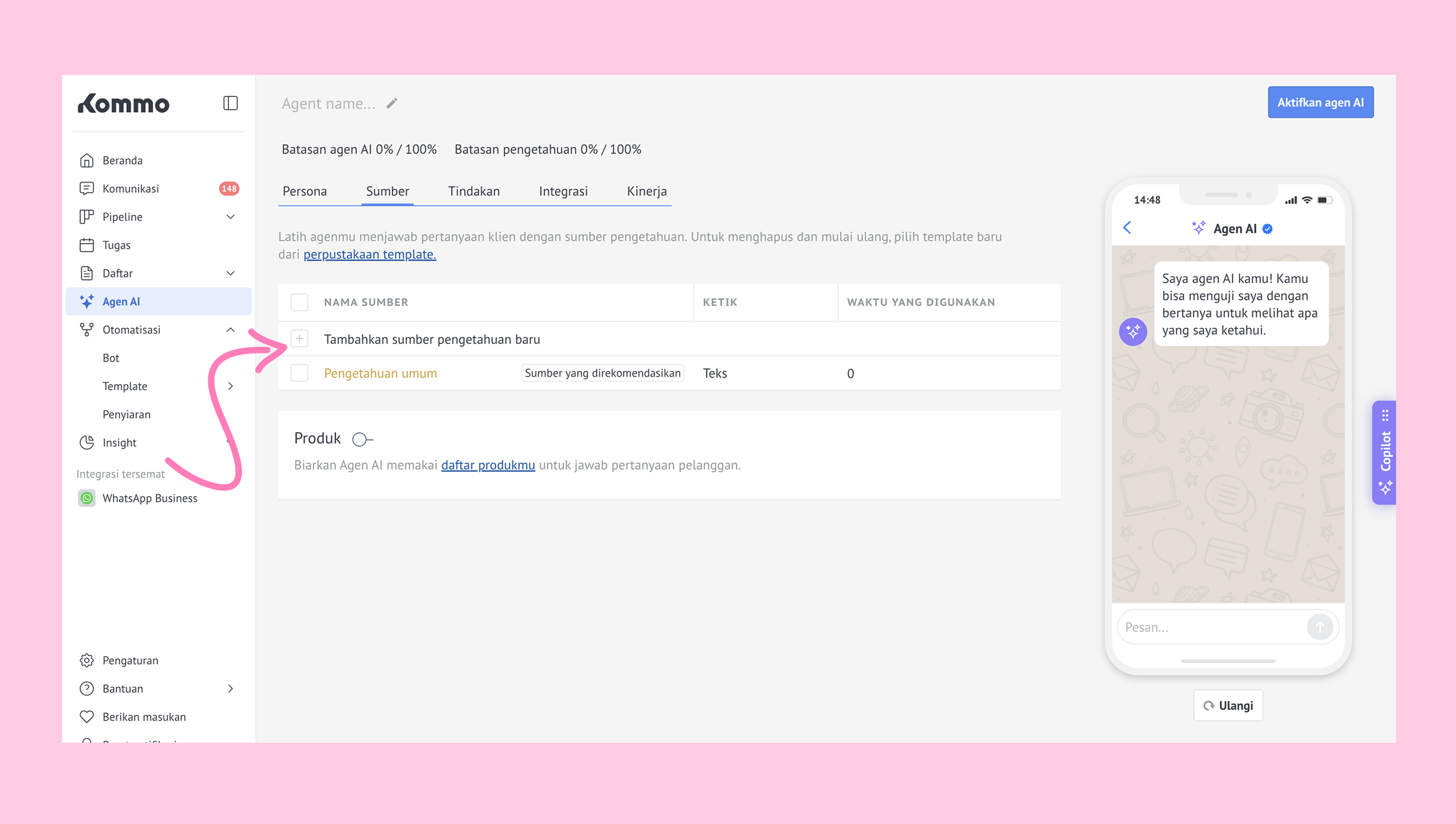 Catatan: Agen AI bisa mengalami kesulitan dengan pertanyaan kompleks yang melibatkan banyak produk atau kategori. Untuk mengatasinya, pastikan informasi di sumber pengetahuan kamu sedetail mungkin.