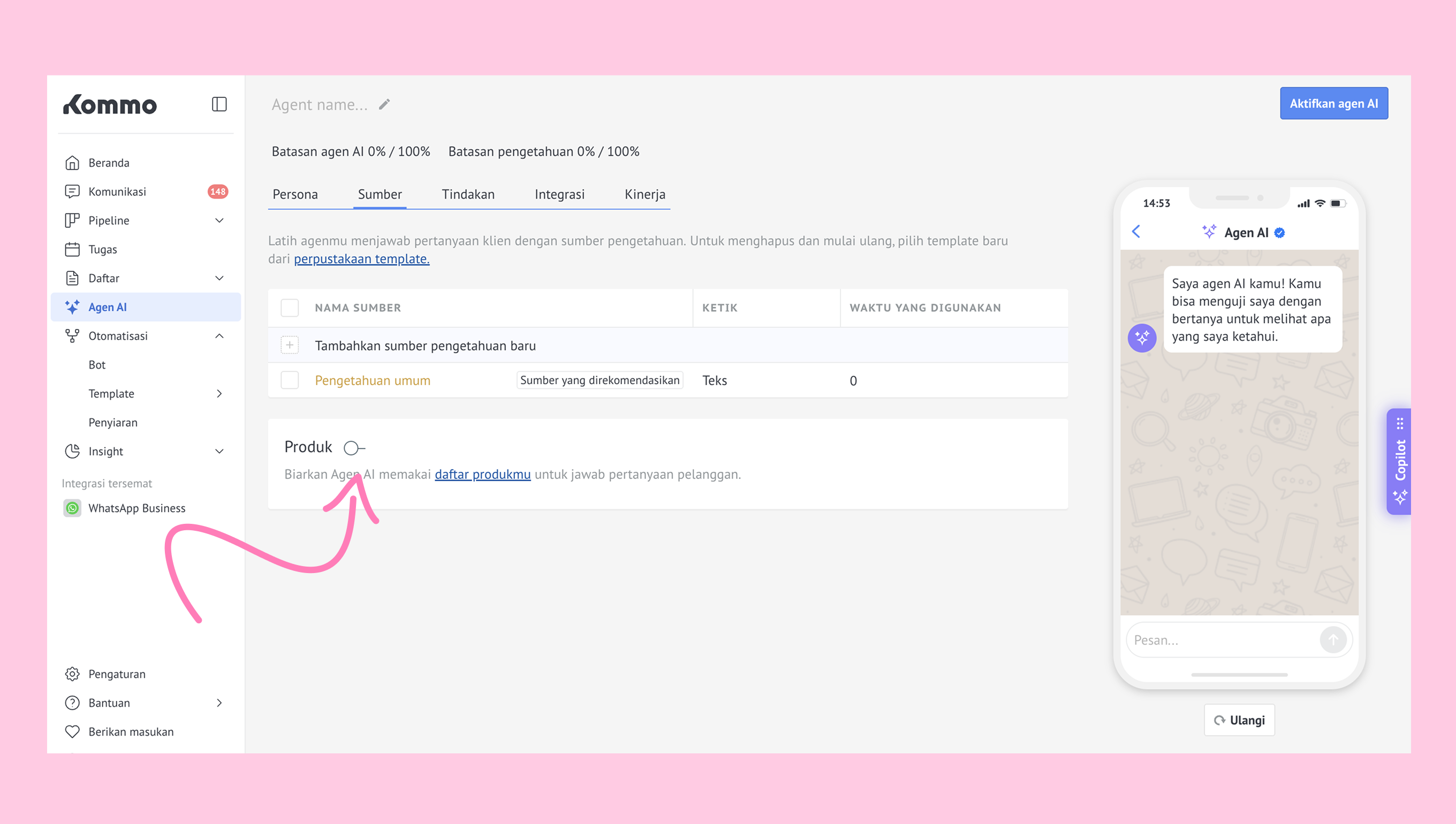 Setelah semua sumber ditambahkan, aktifkan tombol Produk agar agen AI dapat mengakses informasi katalog produk kamu.