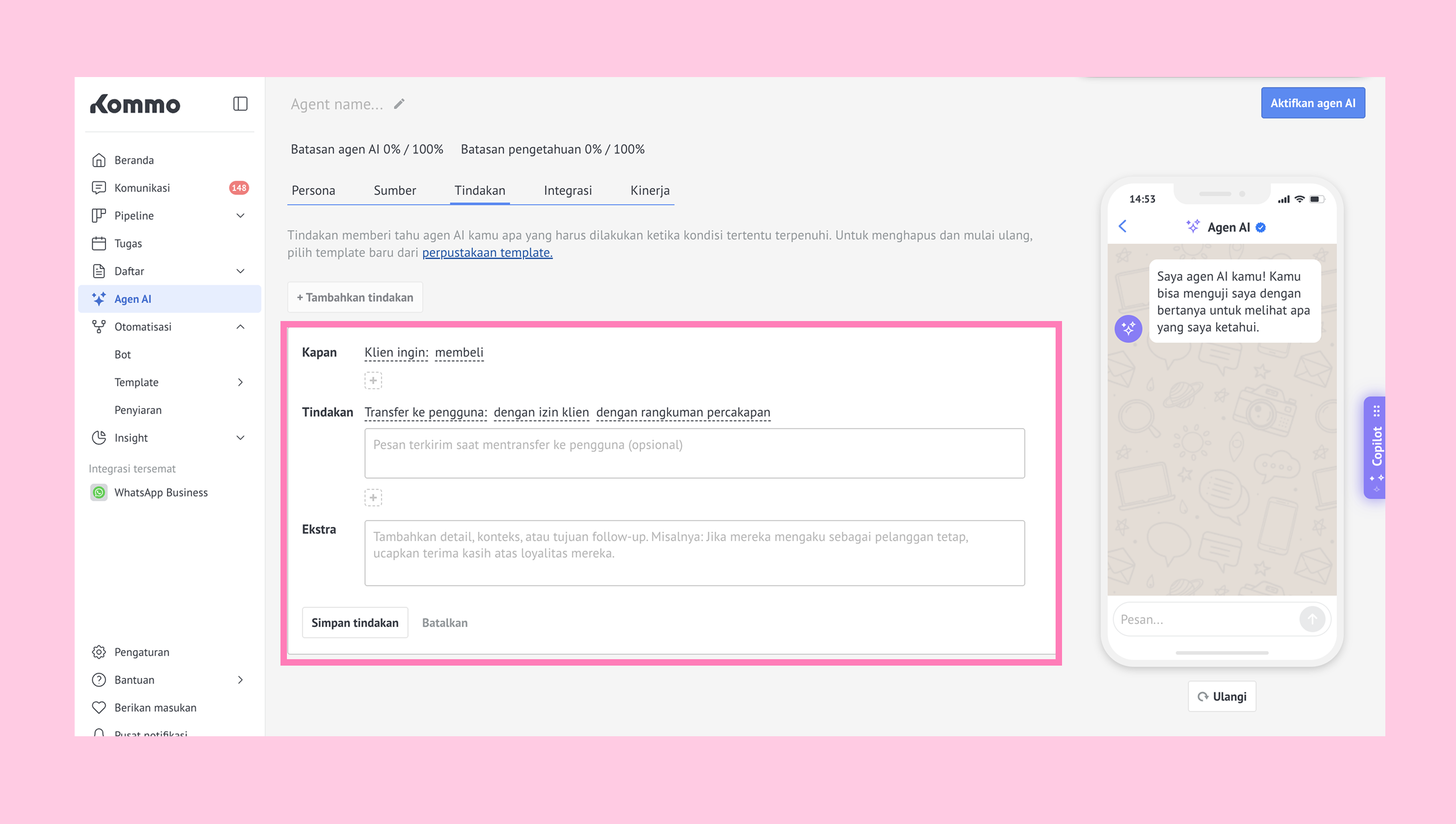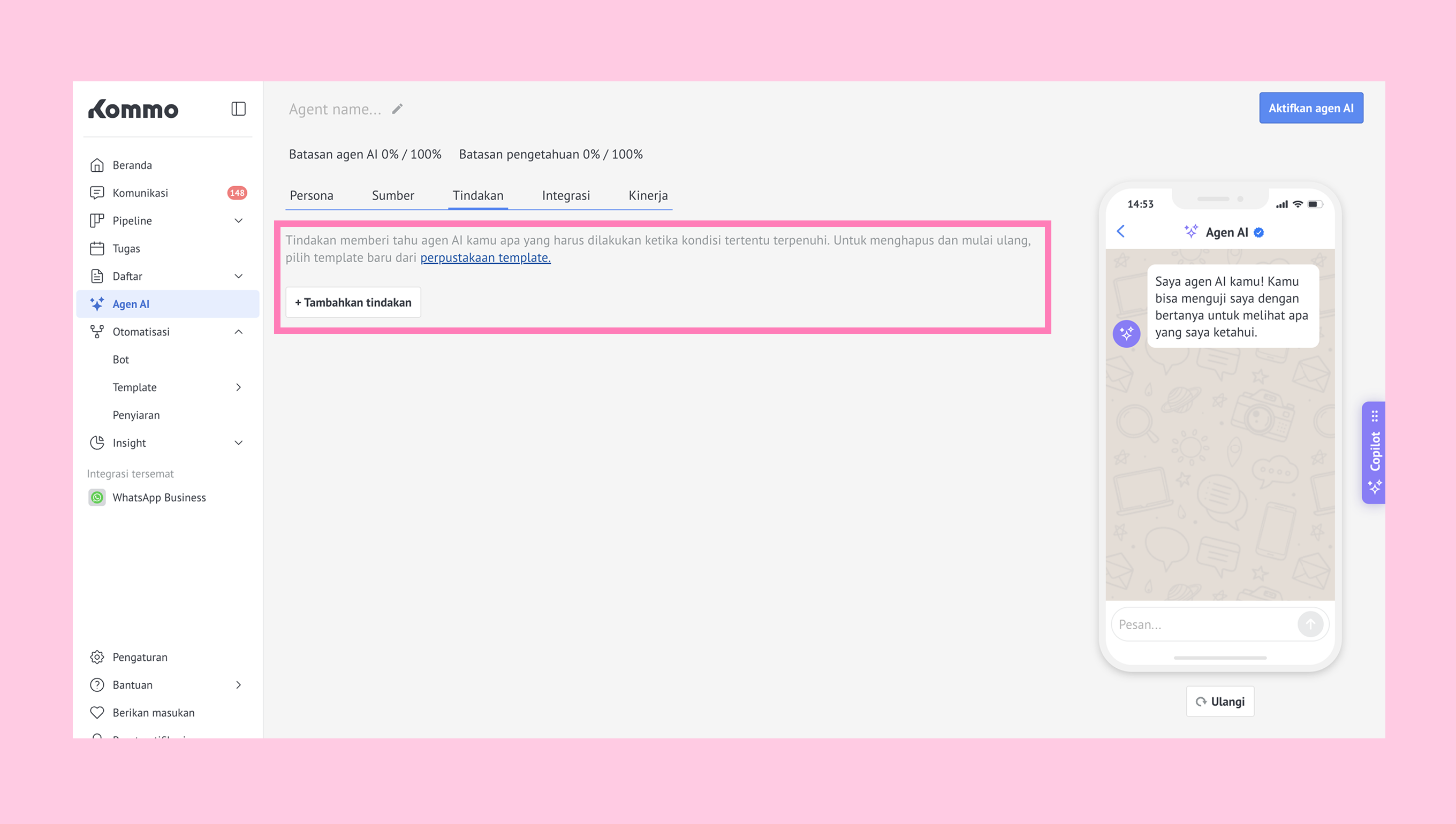 Di tab Tindakan, kamu bisa mengatur agen AI untuk melakukan tindakan berdasarkan kondisi tertentu. Setiap agen mendukung hingga 20 tindakan. Klik + Tambah tindakan untuk membuatnya.