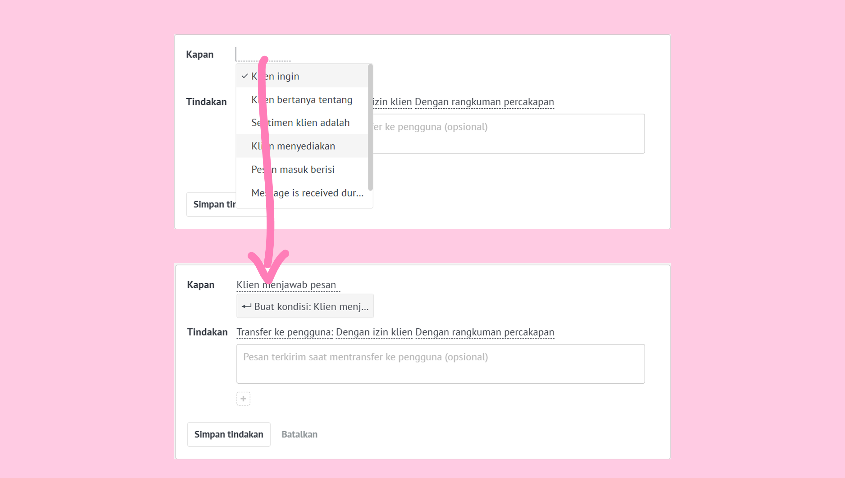- Klien belom merespon selama: (Atur waktu tunggu hingga 24 jam) – hanya tersedia di chat aktif dalam jendela 24 jam, tidak tersedia di paket Base, dengan durasi tunggu 1 menit hingga 23 jam 59 menit sejak pesan terakhir klien.