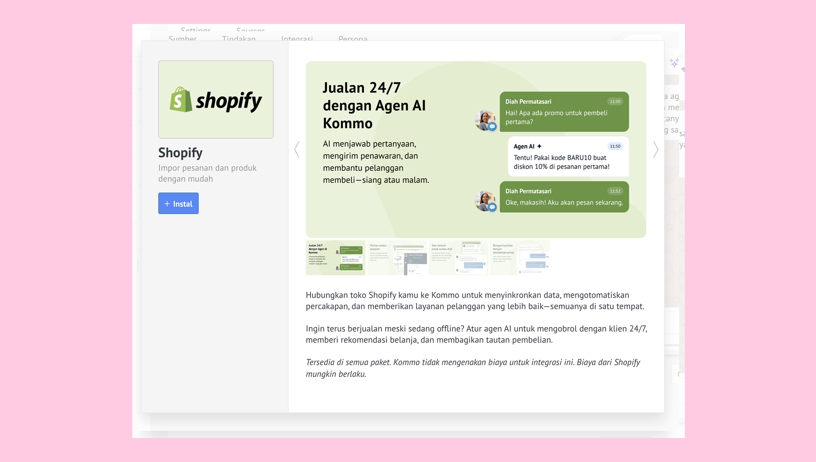 Langkah ini bergantung pada pengaturan Shopify kamu saat ini. Jika toko Shopify kamu sudah terhubung, kamu bisa melewati langkah ini. Klik Instal.