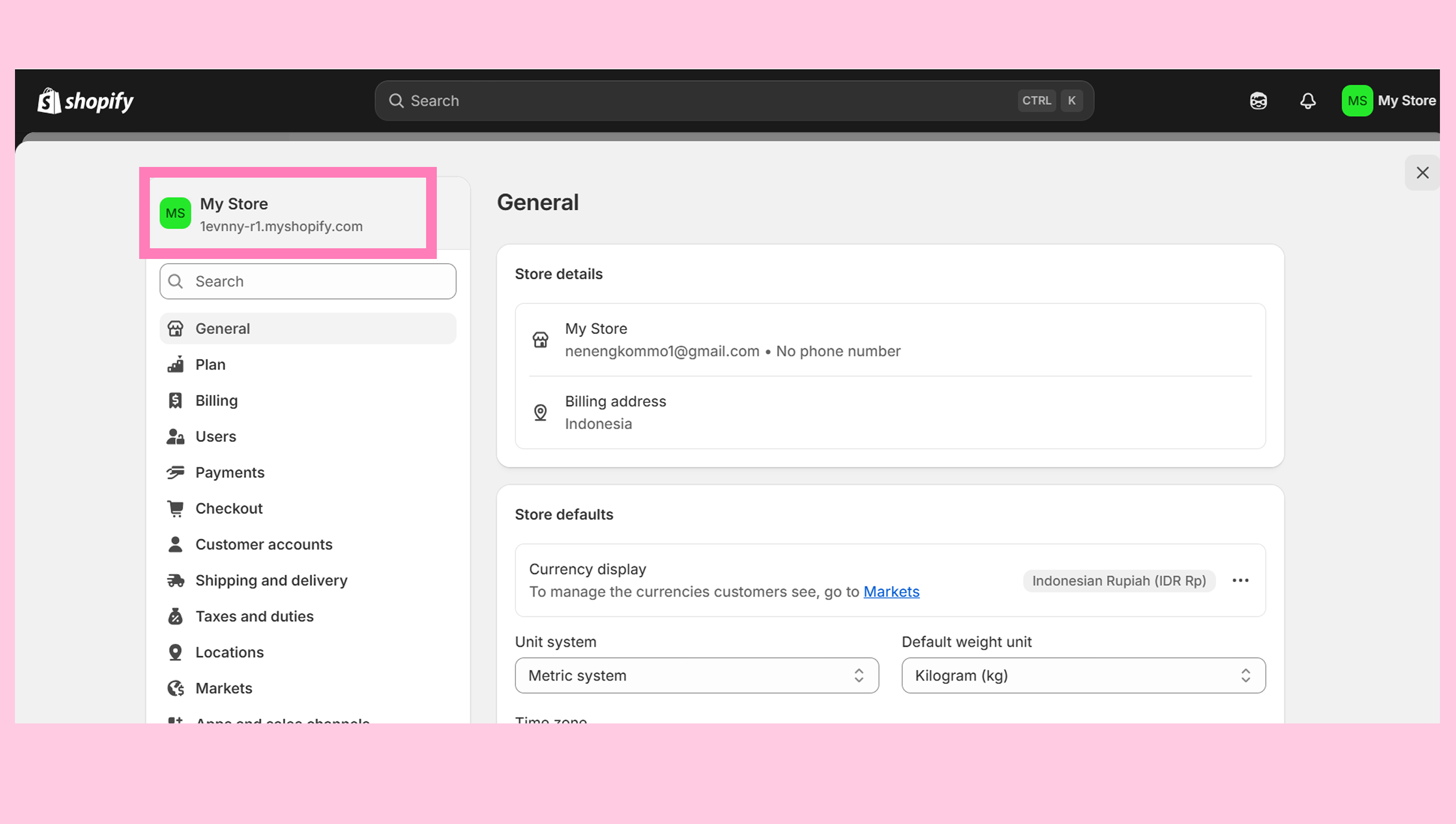Buka pengaturan toko Shopify kamu, salin domain toko yang ada di bawah nama tokomu (misalnya: 9bb49f-c6.myshopify.com) lalu tempelkan ke jendela modal integrasi. Klik Hubungkan untuk menyelesaikan integrasi.