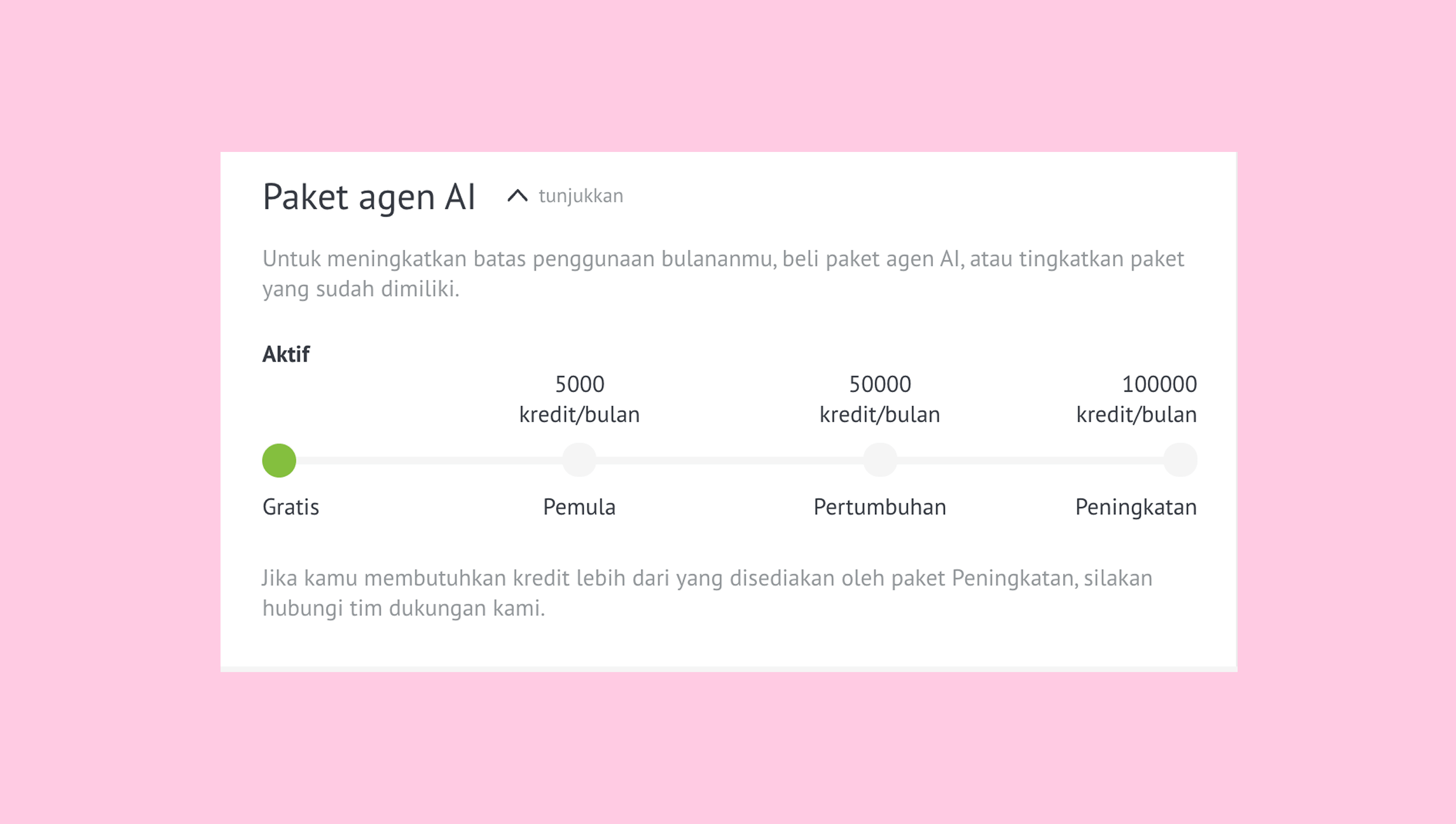Kamu bisa membeli paket agen AI untuk pertama kali dan meng-upgrade ke paket yang lebih tinggi kapan saja.
