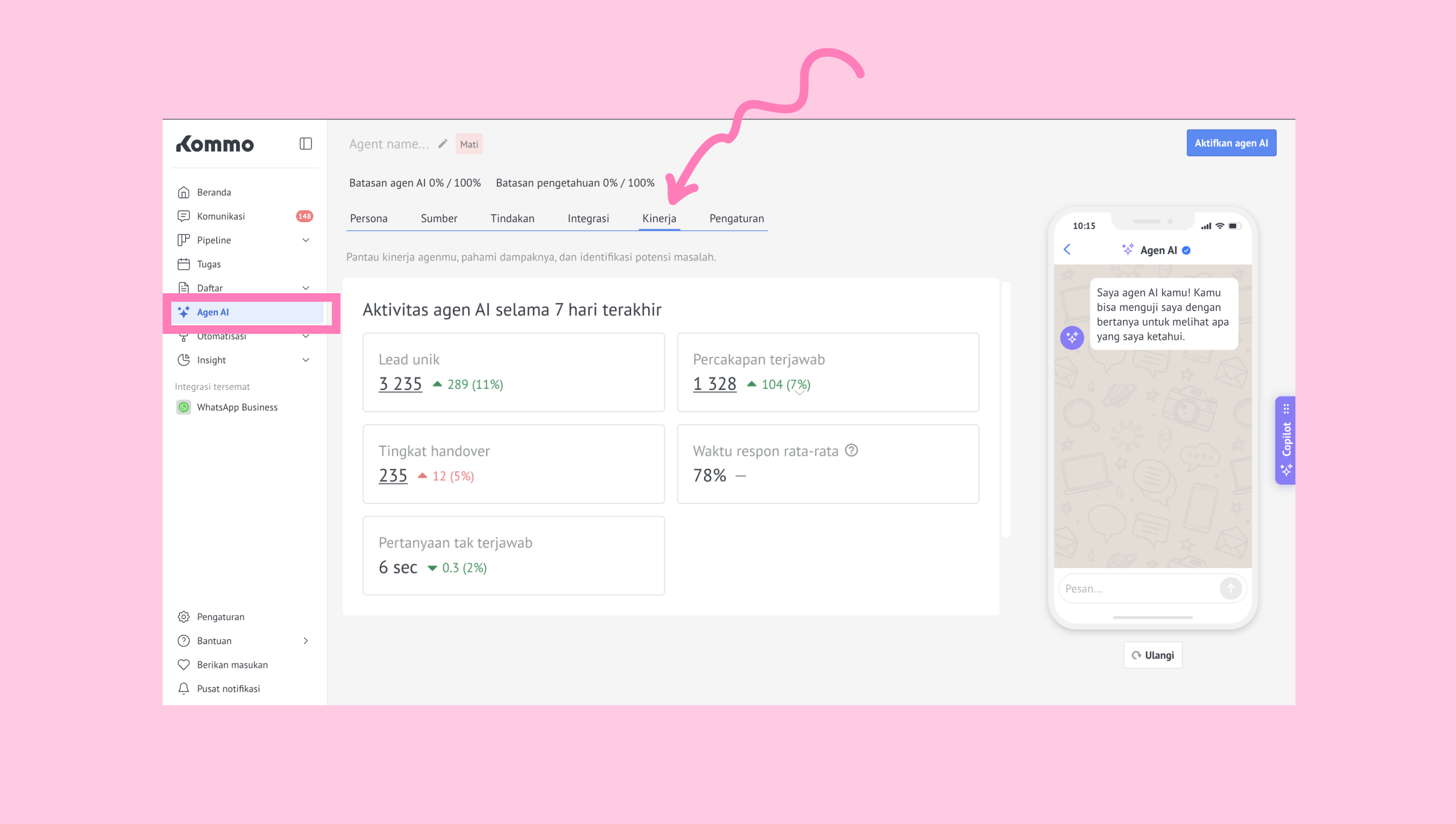 Untuk melihat penggunaan kamu saat ini, buka Agen AI → tab Kinerja. Di sana, kamu bisa melihat seberapa sering agen AI membalas dan aktivitasnya selama 7 hari terakhir.