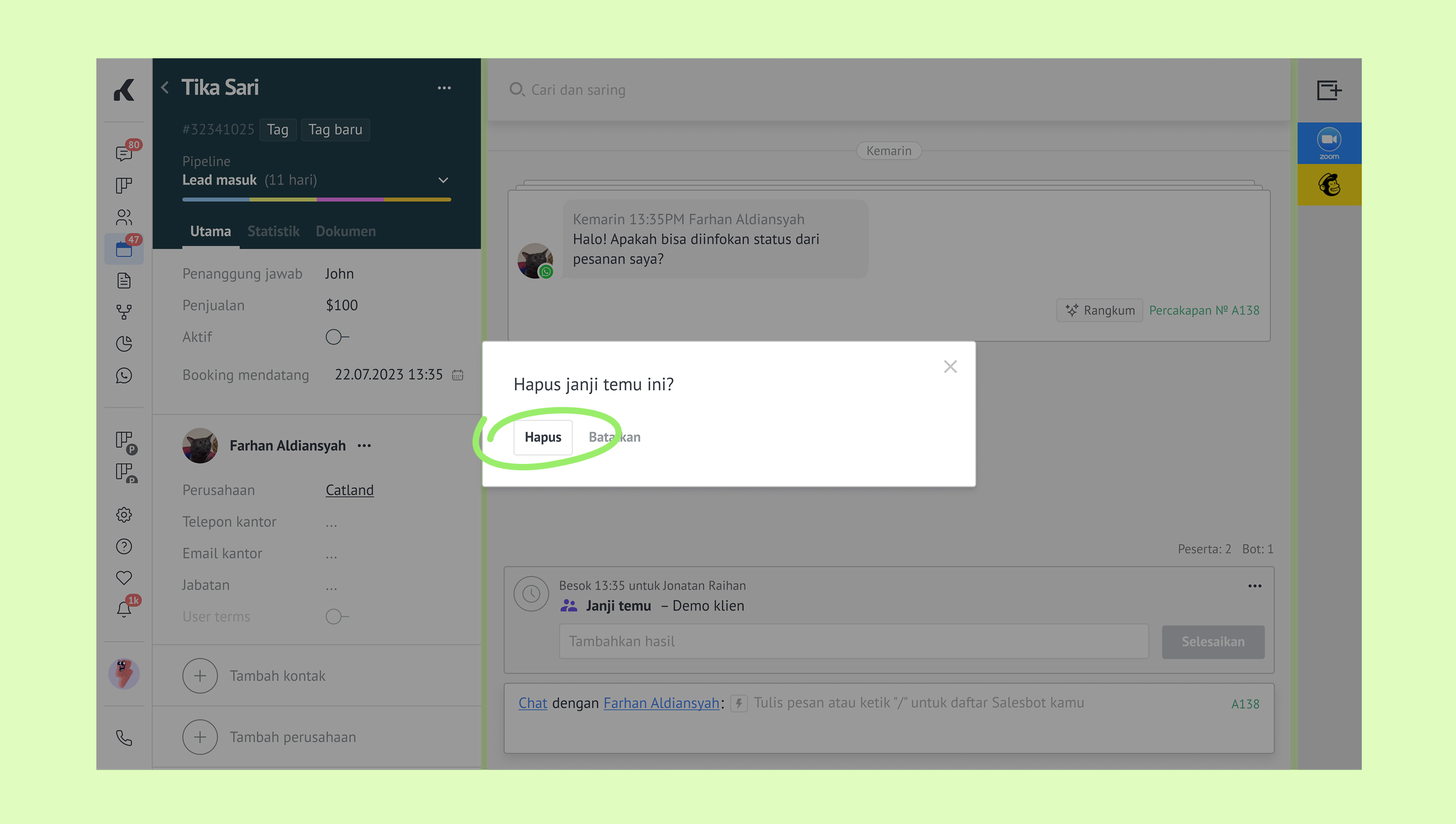 Buka Kalender. Klik janji temu yang ingin dibatalkan. Kartu lead akan terbuka.
