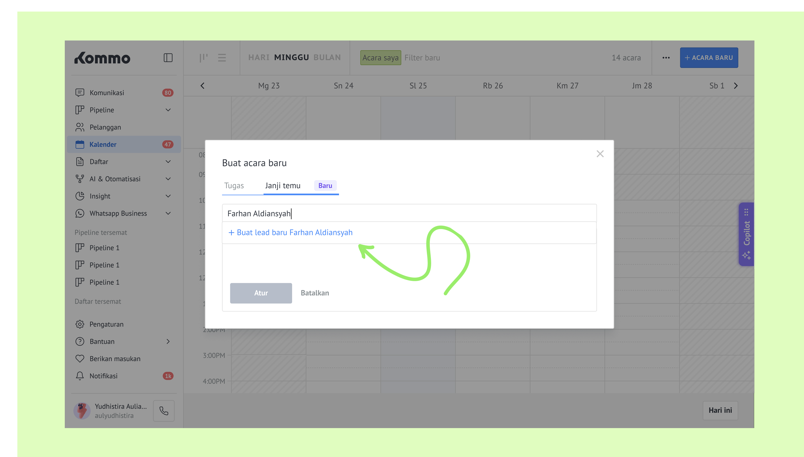Masukkan nama lead. Jika lead sudah ada, sistem akan menampilkannya secara otomatis.
