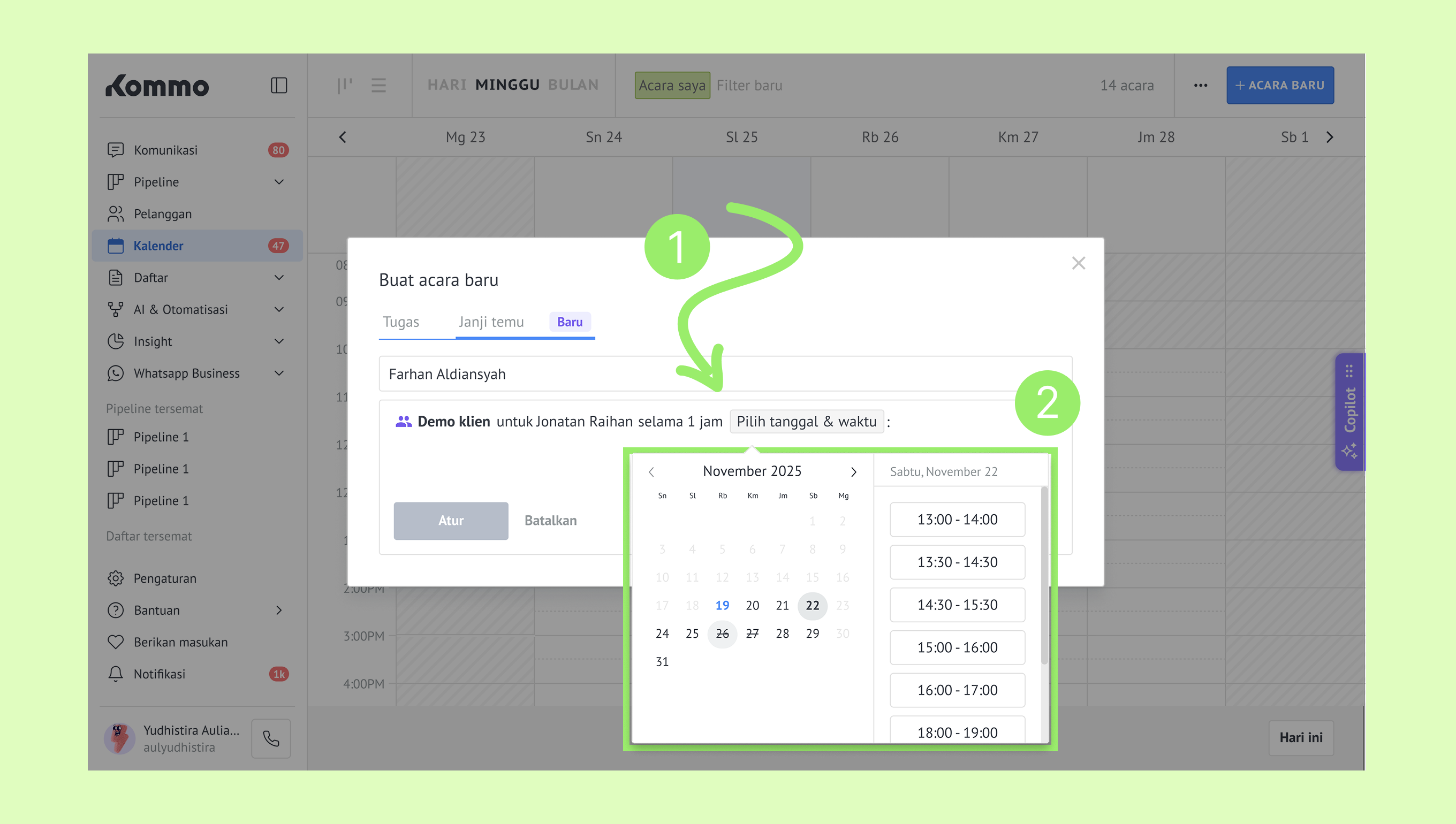 Hanya pengguna dengan peran Admin yang dapat mengatur jadwal dan jenis janji temu. Notifikasi kepada lead hanya dapat dikirim via Salesbot.