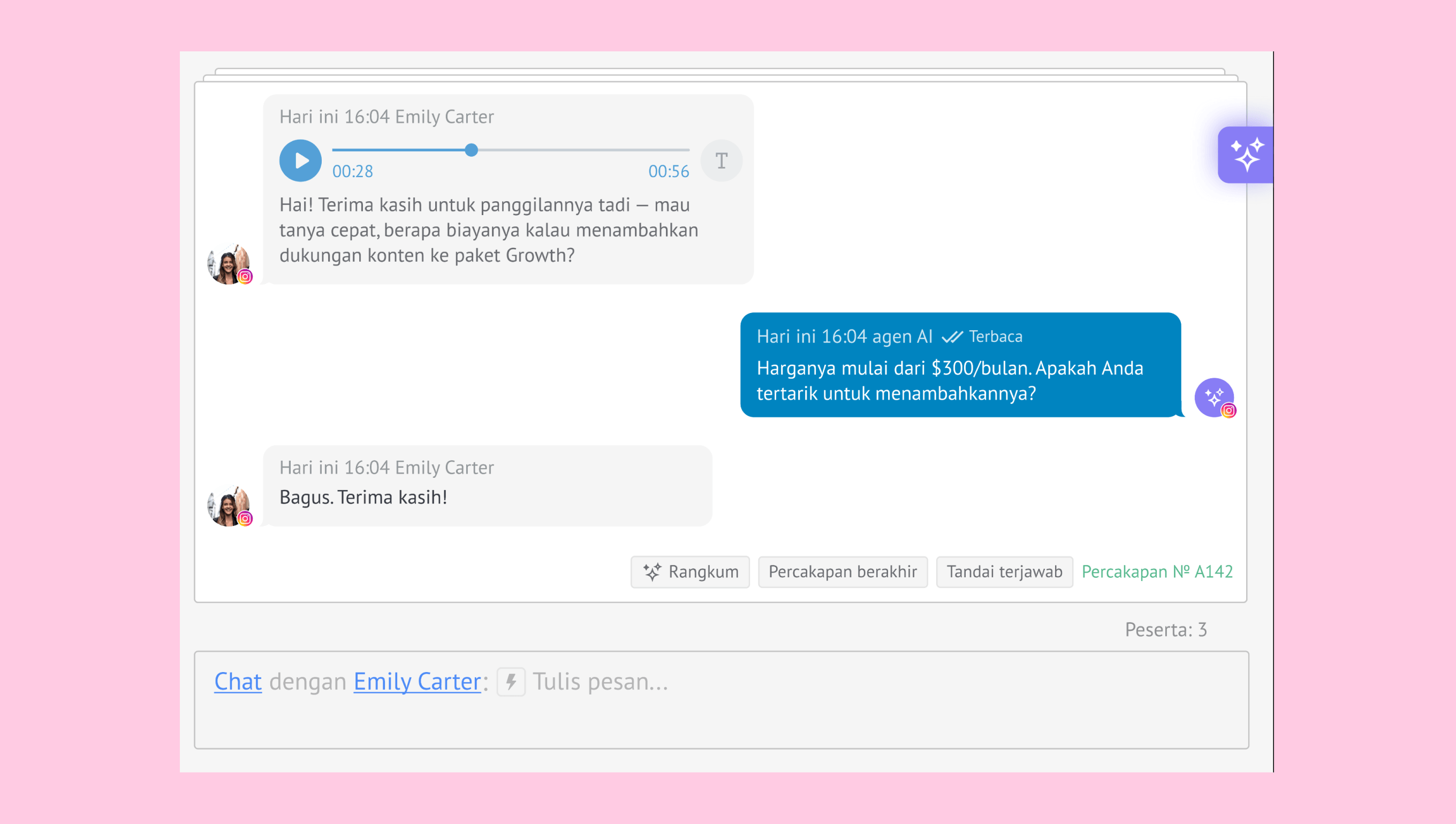Memahami niat lead – Agen mengenali apa yang diminta lead dan merespons sesuai konteks, misalnya dengan membagikan info, mengajukan pertanyaan lanjutan, atau meneruskan chat ke tim kamu.