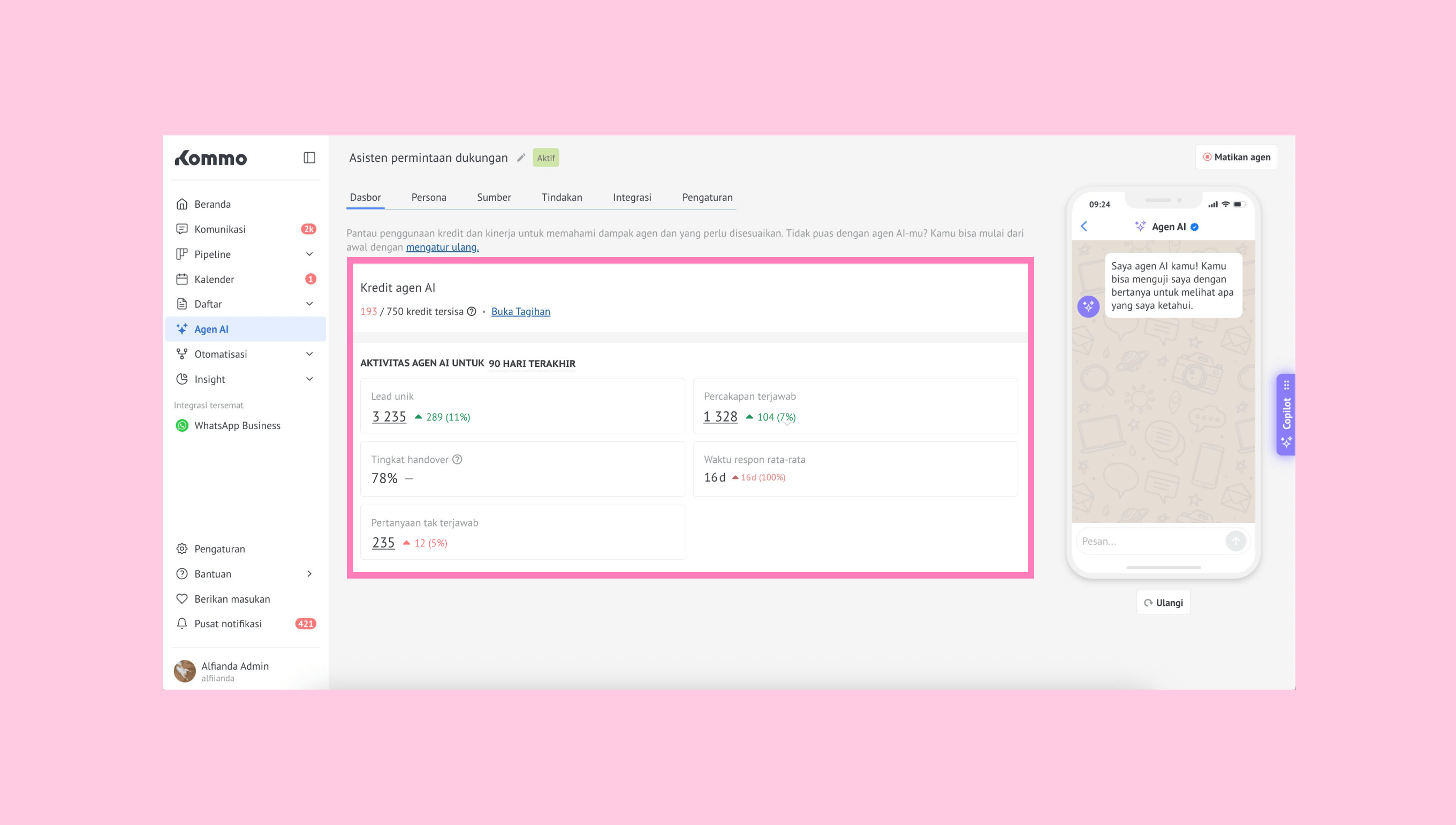 Melacak aktivitas agen AI — dengan metrik utama seperti Lead unik, Percakapan terjawab dan tak terjawab, Tingkat handover, dan Waktu respon rata-rata.