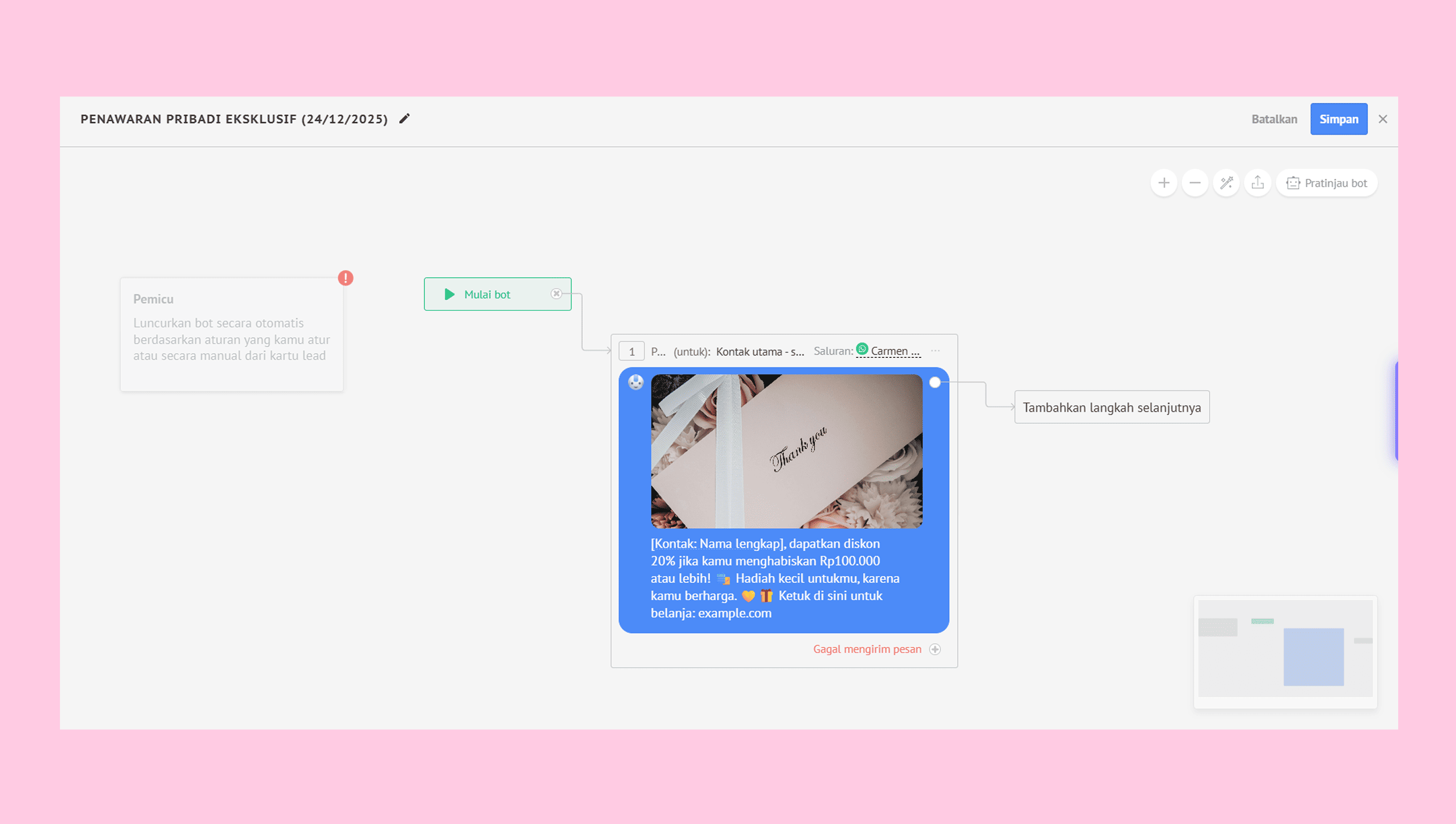 Ini akan membuka pembuat bot, tempat kamu dapat mengatur balasan otomatis bagi lead yang merespon.