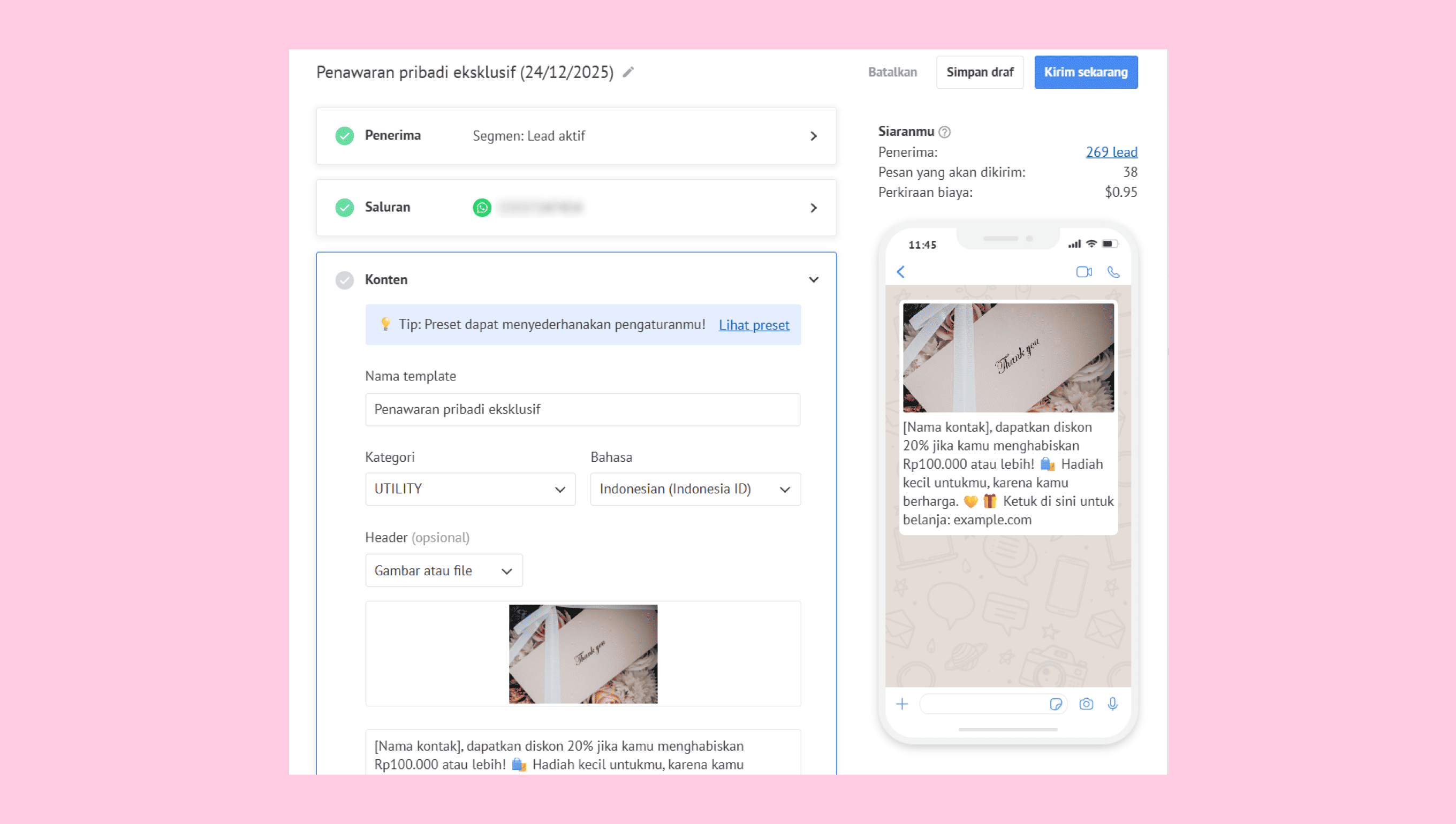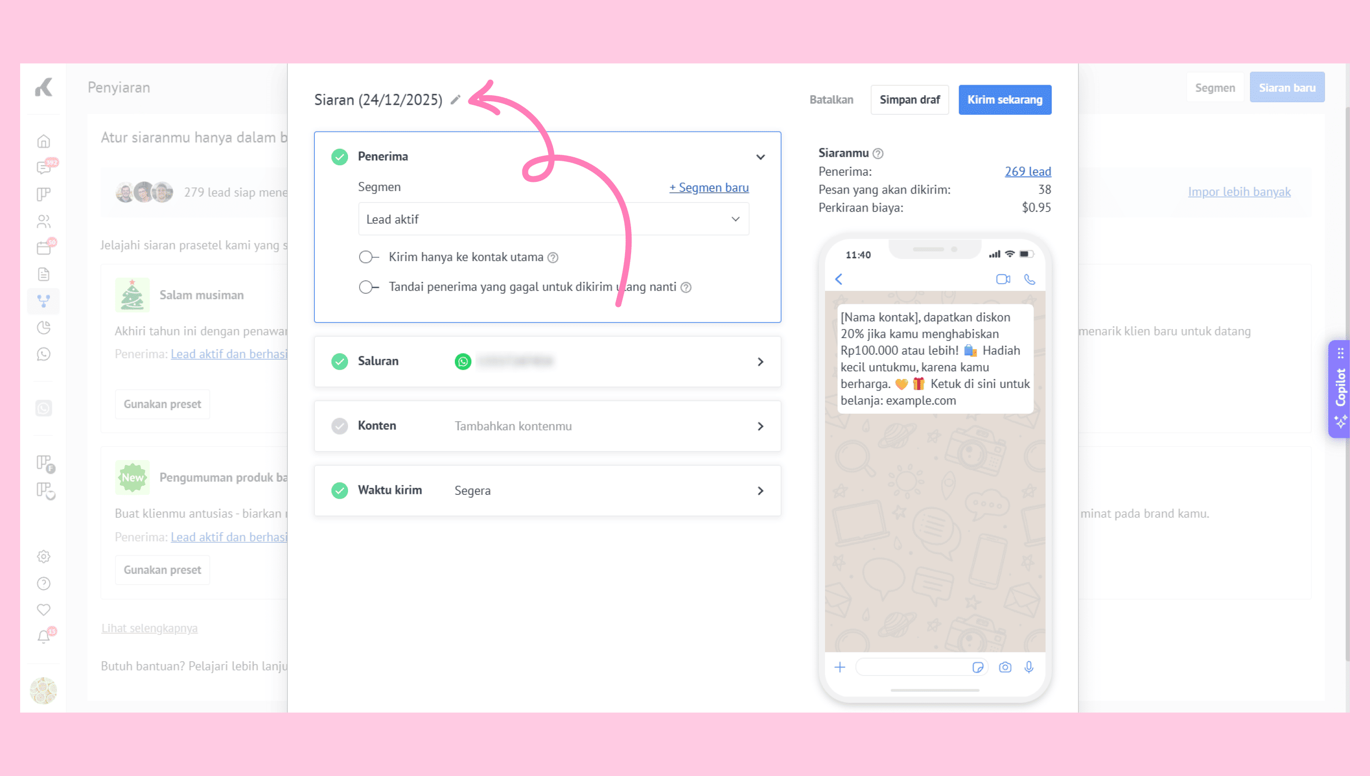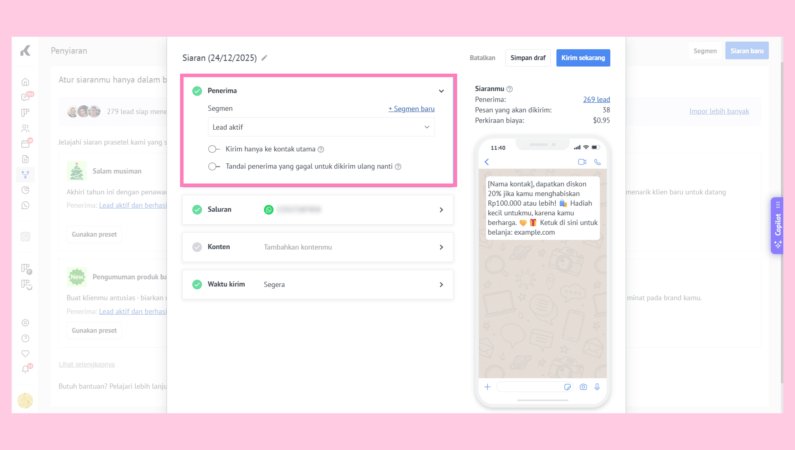 Manajemen penerima sudah tersedia di pembuat siaran. Kamu bisa membuat segmen khusus atau memilih segmen yang sudah ada — secara default, Lead aktif dipilih.
