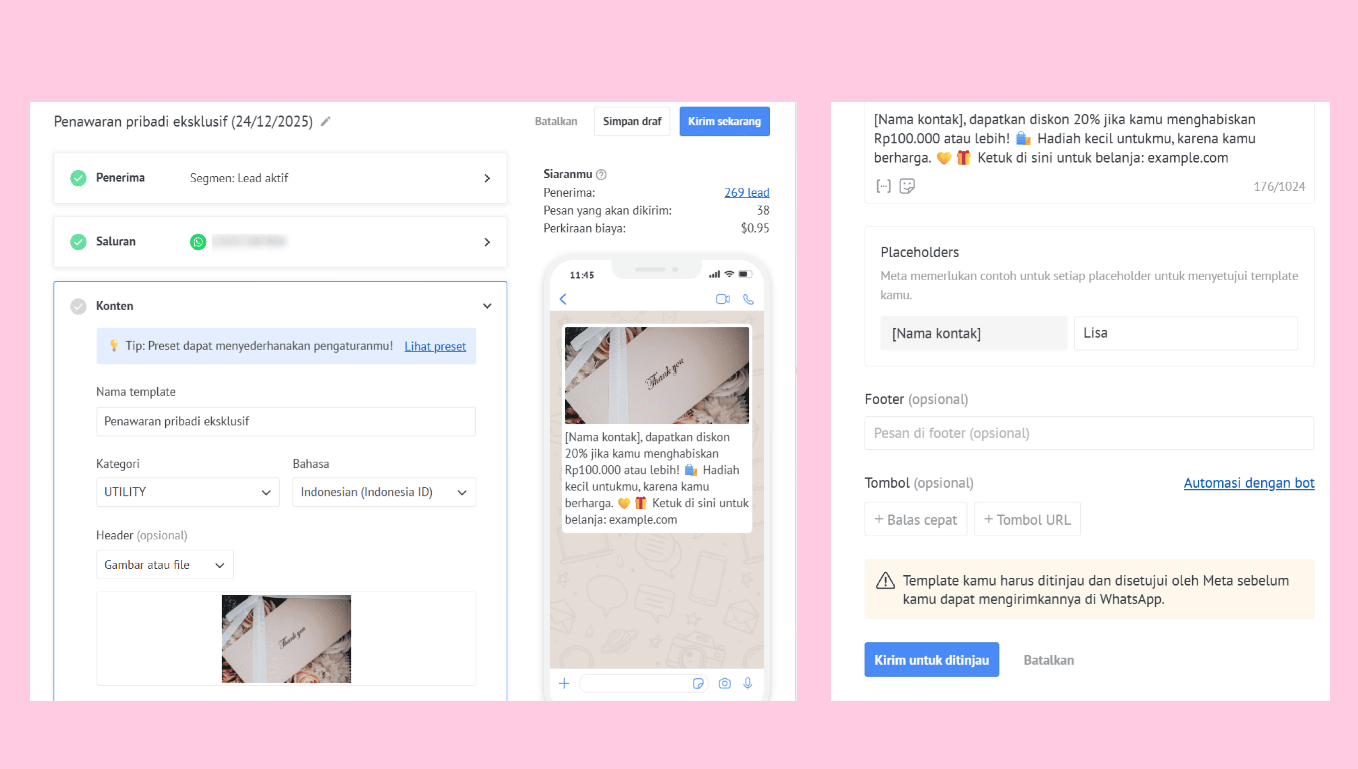 Template tidak perlu disetujui sebelumnya; kamu bisa menggunakan template yang ada atau membuat yang baru.