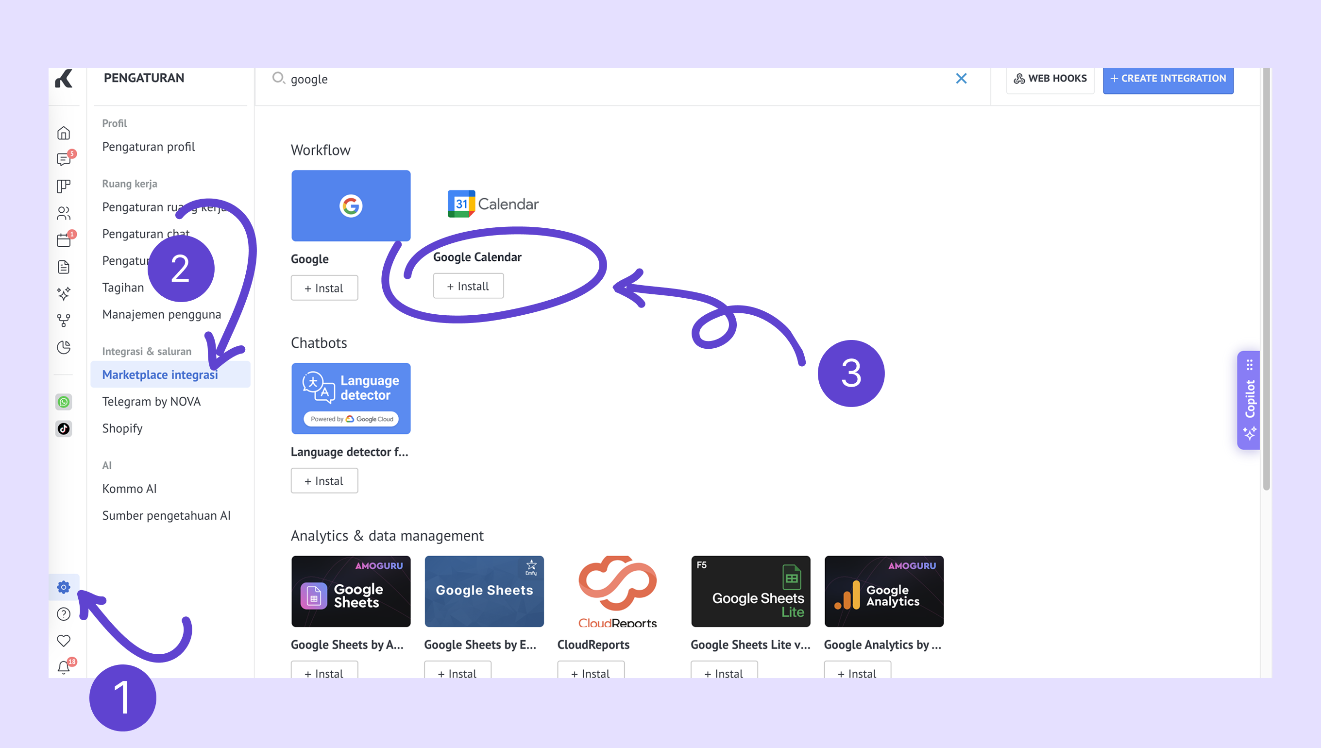 Buka Pengaturan → Marketplace integrasi → cari Google Kalender → klik Instal.