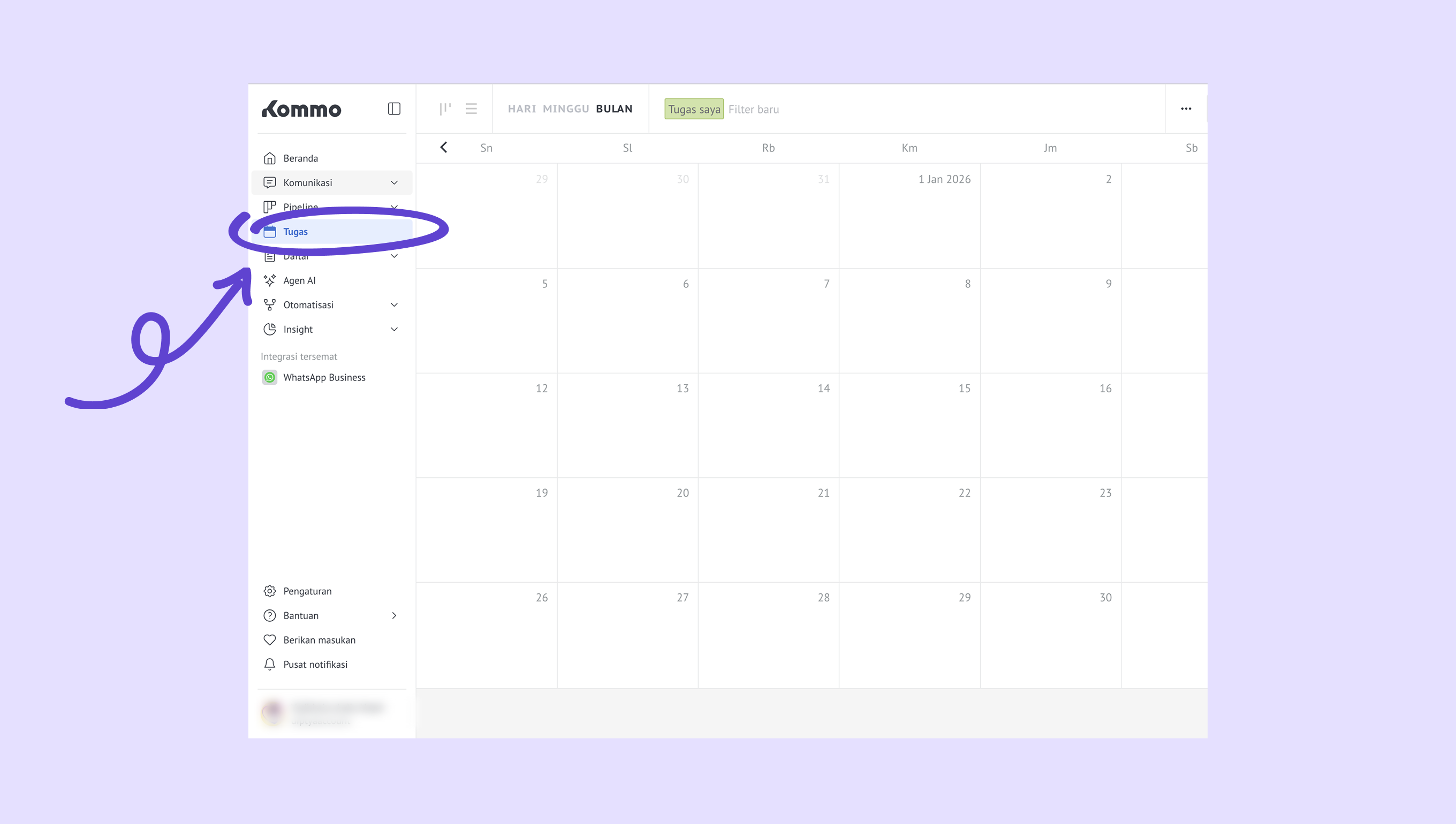 Buka Kommo → Tugas. Jika sinkronisasi berhasil, acara atau tugas tersebut akan muncul di Kommo. Acara tampil di kalender Kommo, dan tugas dibuat secara otomatis.