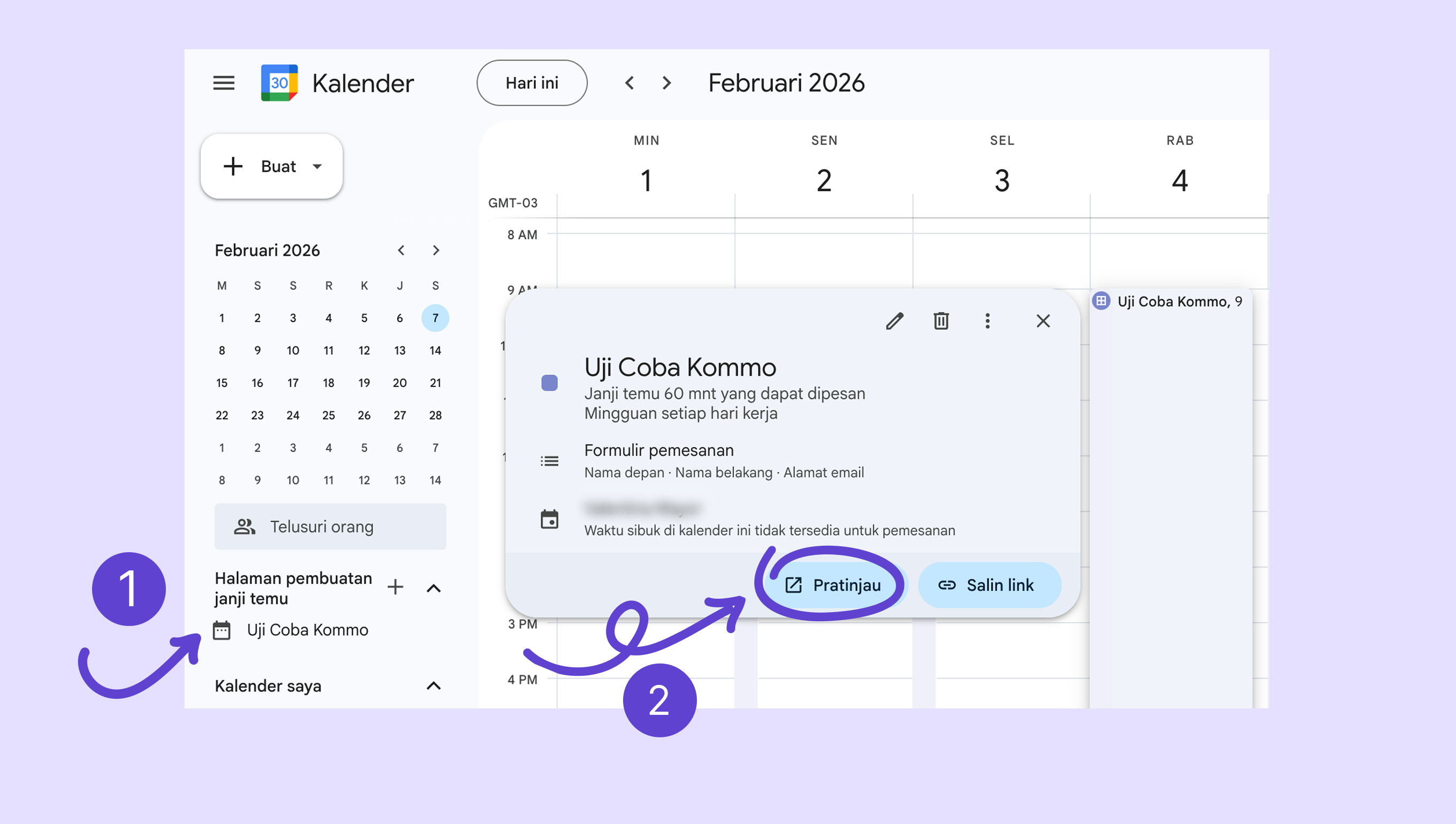 Buka bagian Halaman Booking, pilih jadwal kamu → klik Pratinjau.