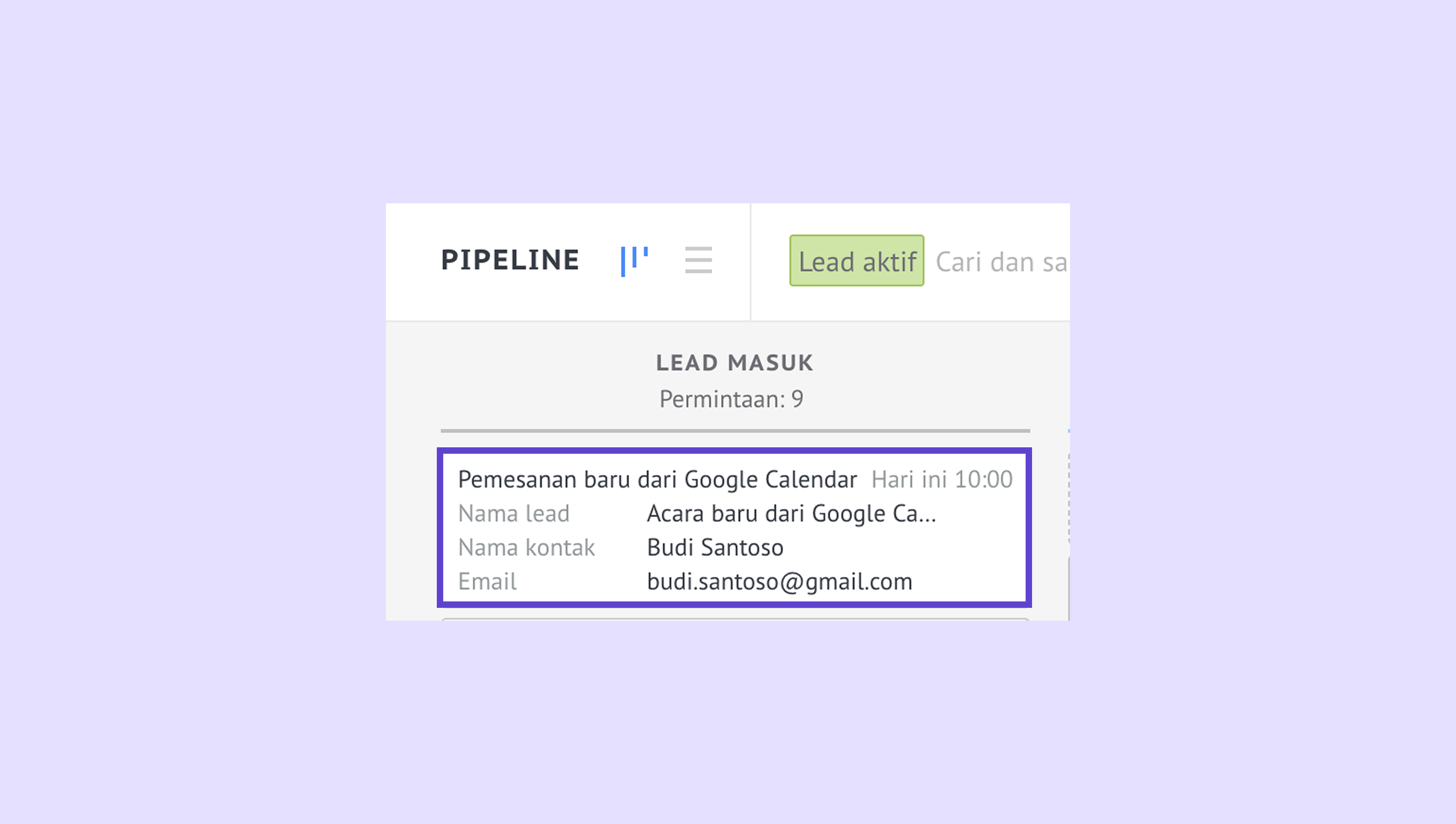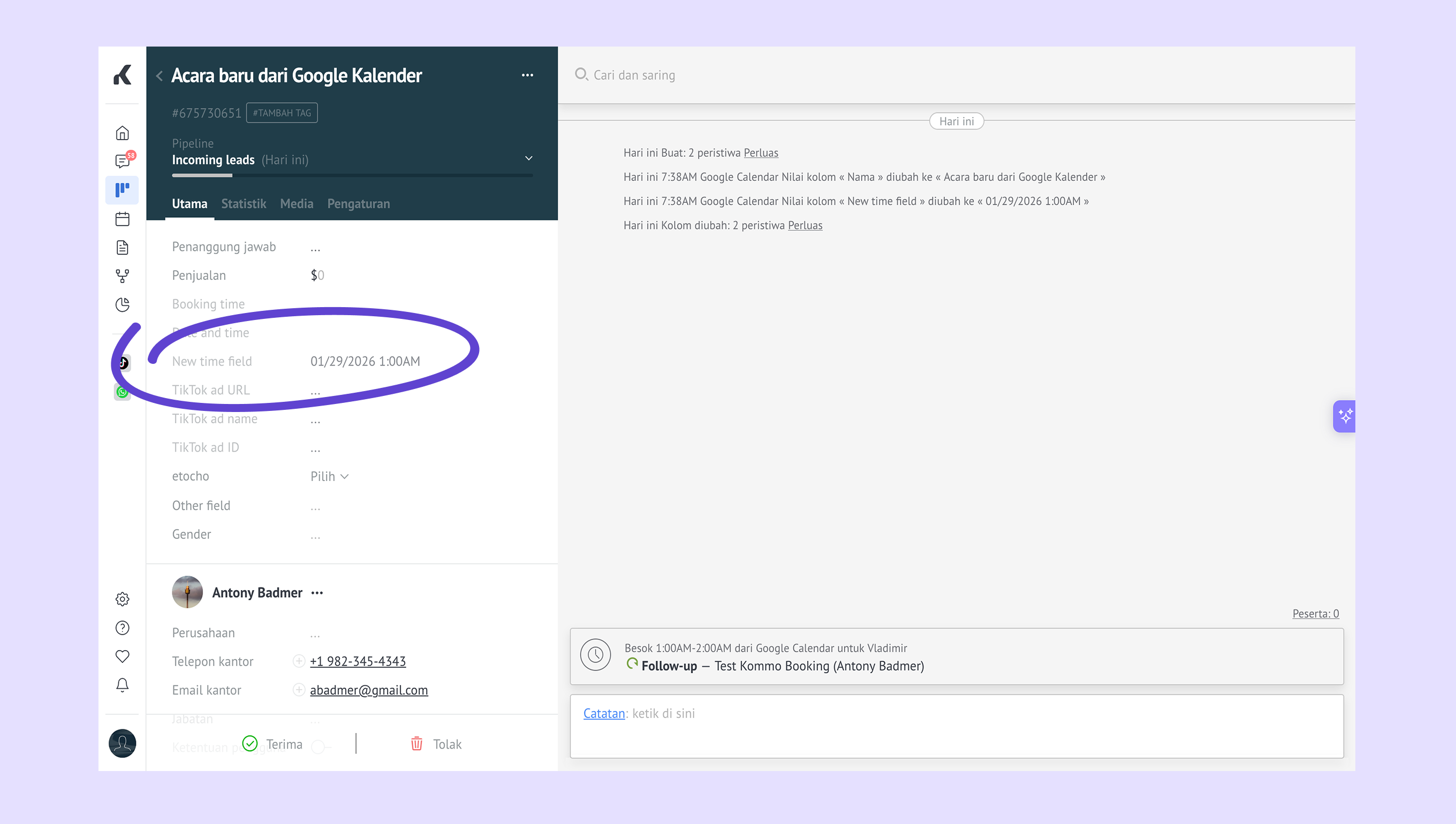 Kamu juga bisa menyimpan tanggal dan waktu pertemuan ke kartu lead saat klien menggunakan fitur Jadwal janji temu. Caranya: