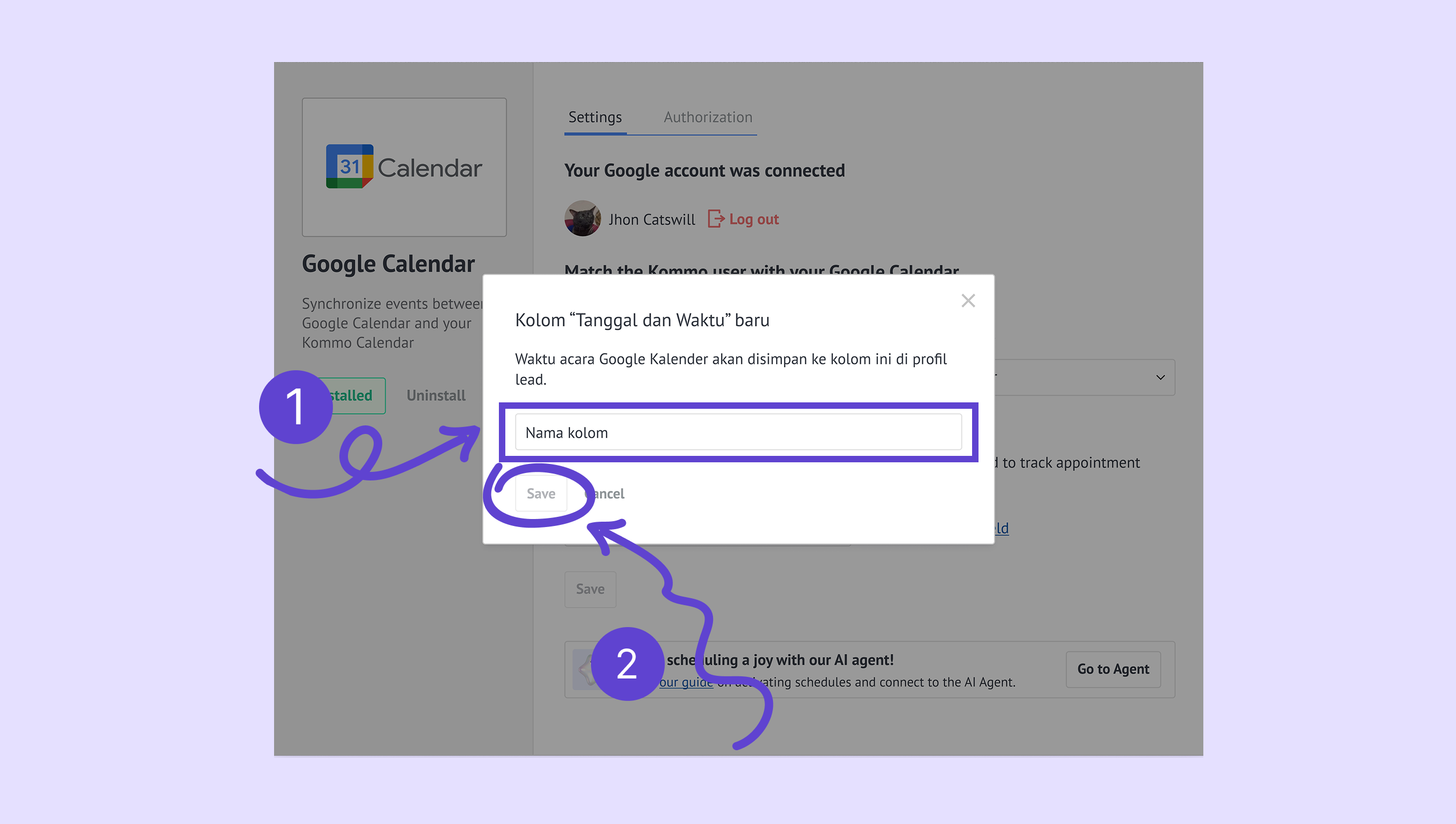 Masukan nama kolom kustom yang baru dan klik Simpan. Kamu bisa menyesuaikan nama kolom dengan konteks kalender, misalnya: Janji Temu Salon X.