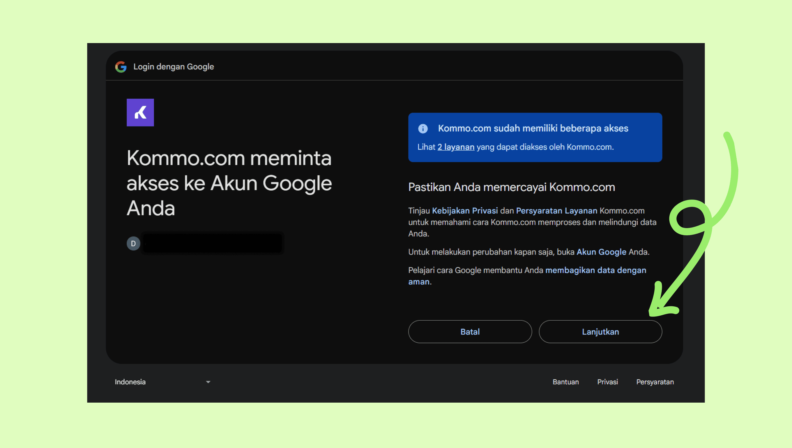 Kamu akan diarahkan untuk login ke akun Google. Pilih akunmu lalu klik Lanjutkan.