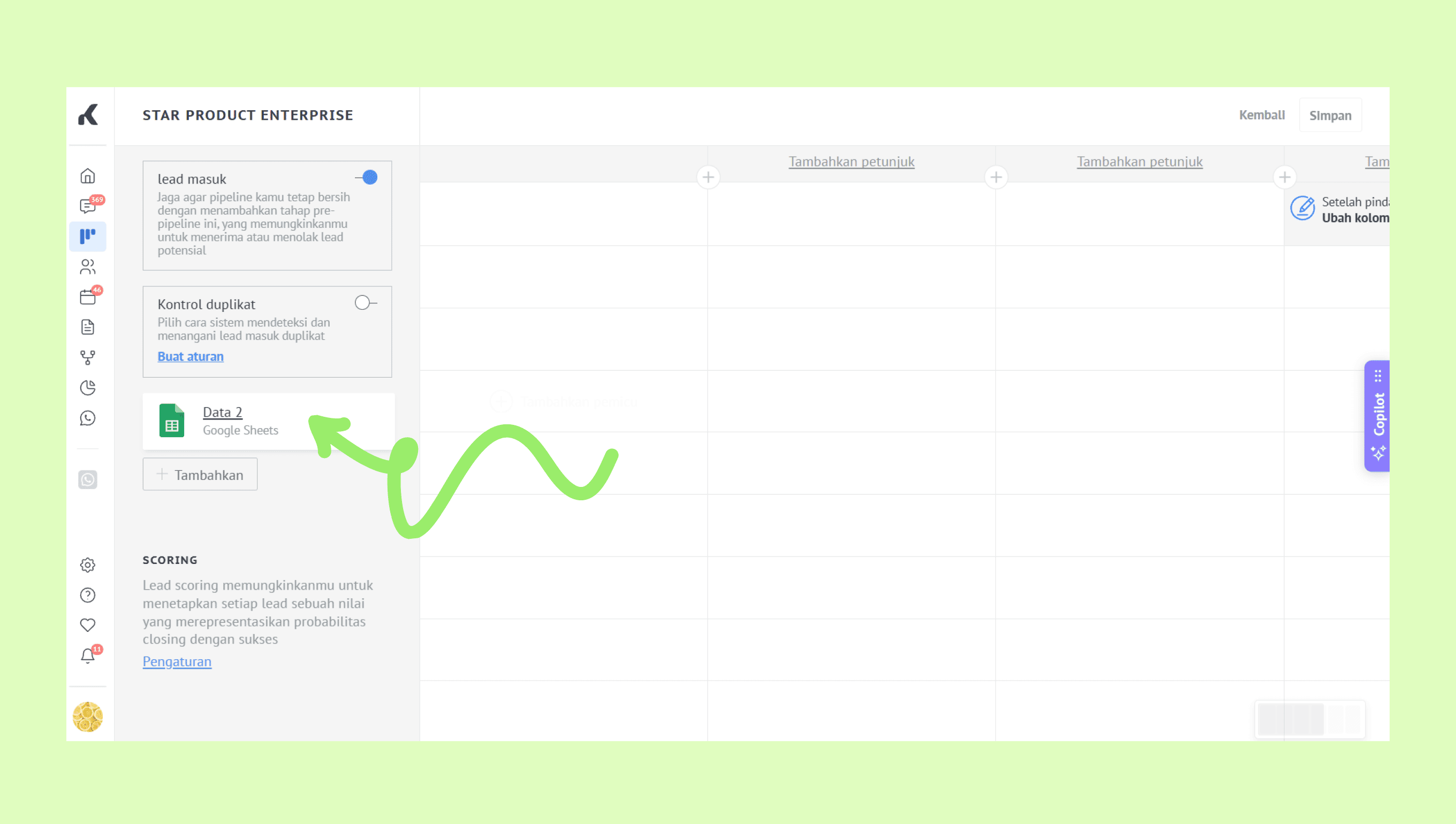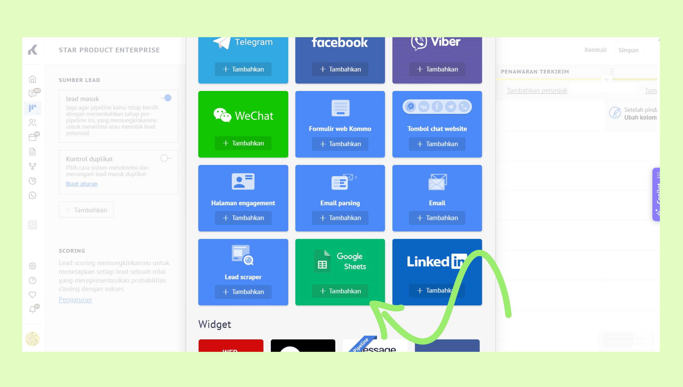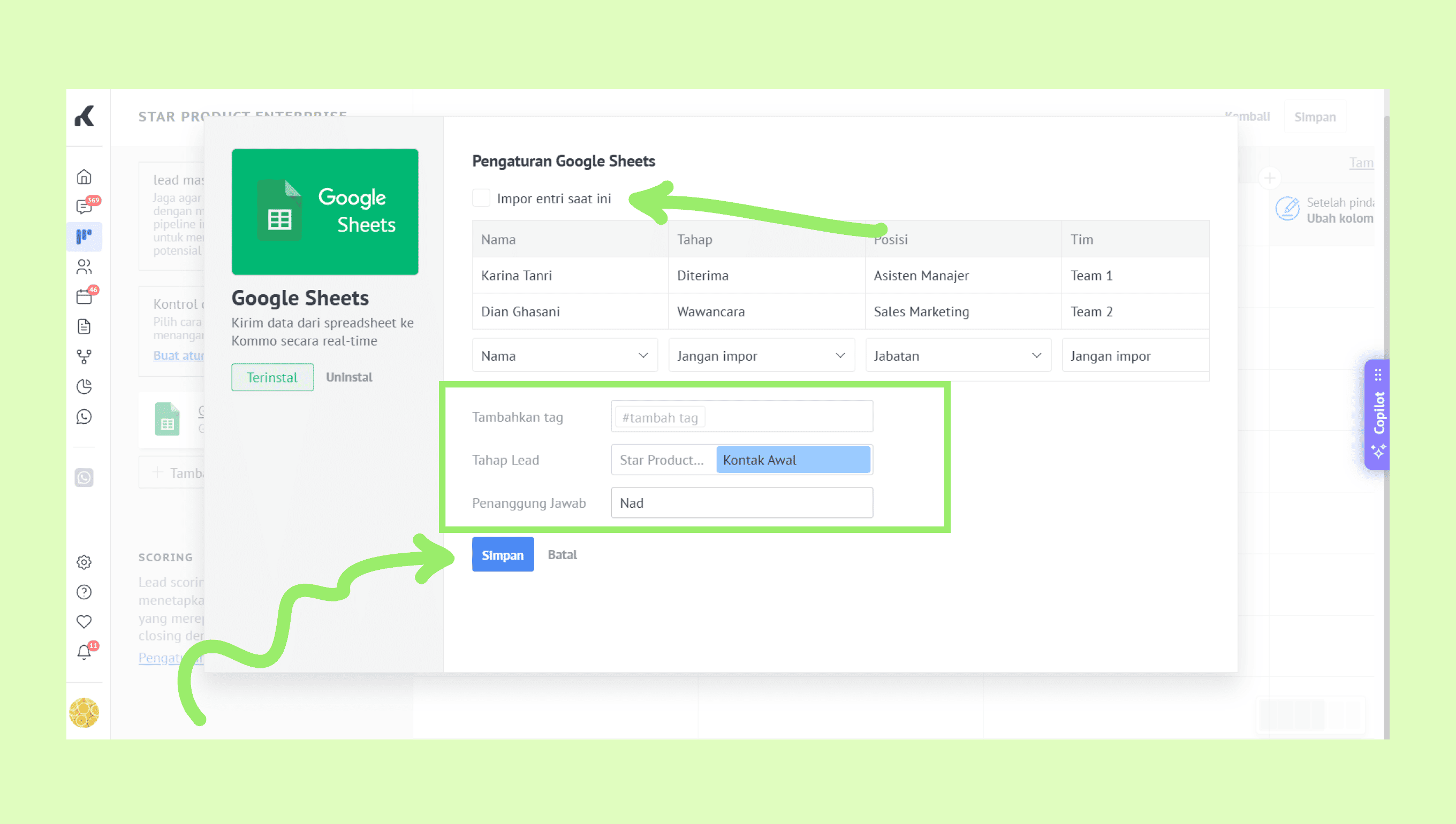 Tambahkan tag: Tetapkan tag secara otomatis ke lead baru yang dibuat dari spreadsheet. Ini membantu mengelompokkan dan memfilter lead dengan lebih efisien di Kommo.