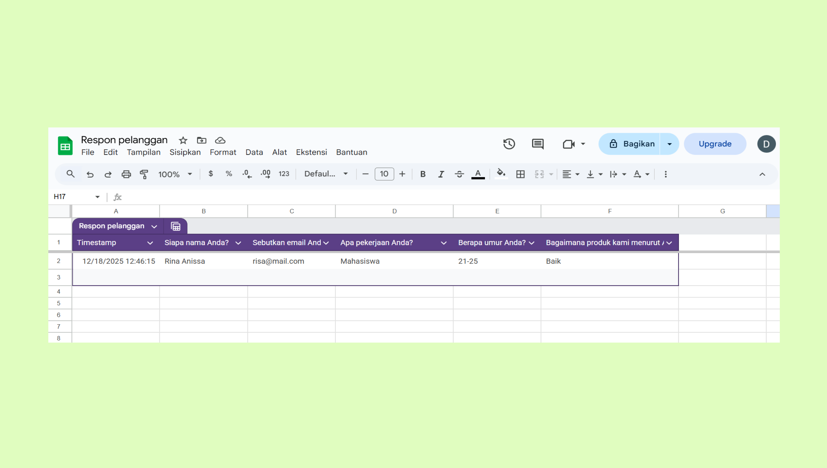 - Google Form muncul di Google Sheets: