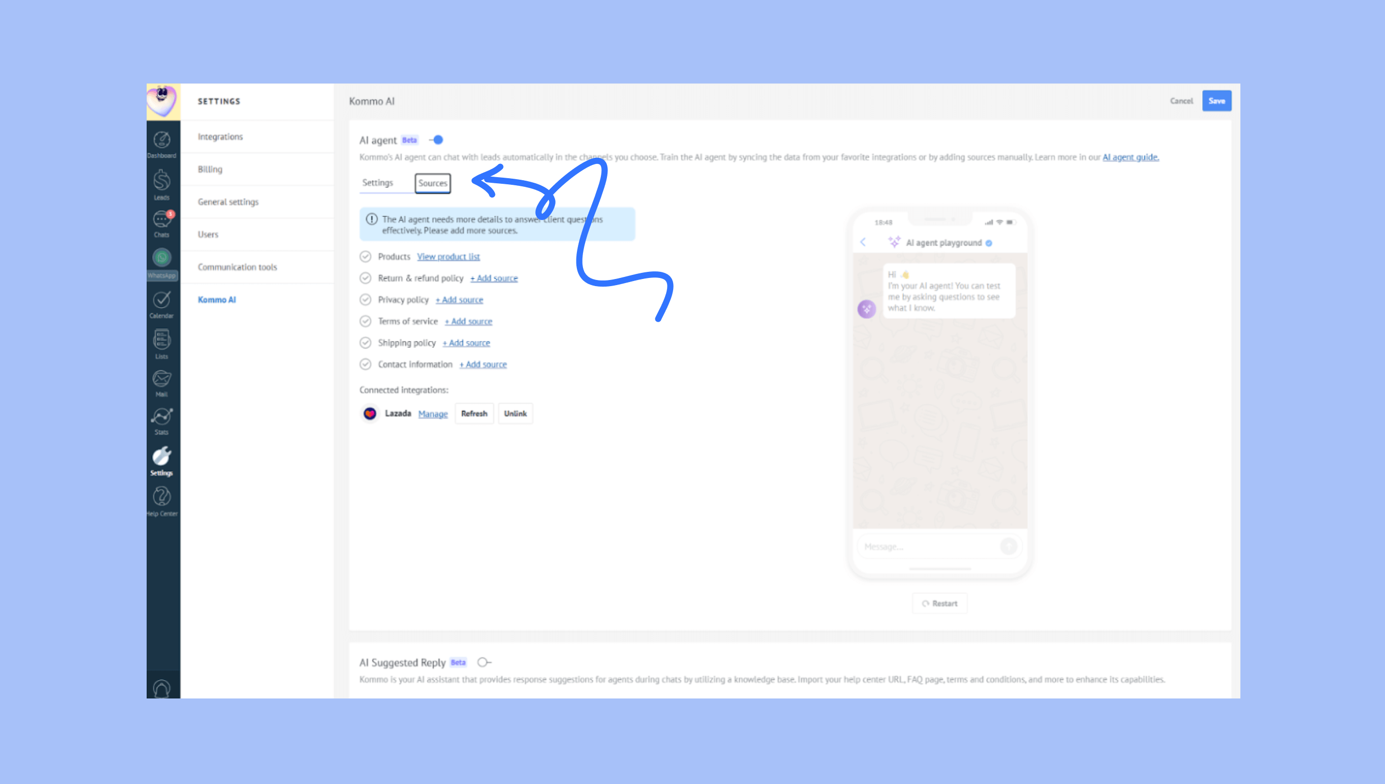 Buka tab Sumber untuk menyesuaikan data yang bisa digunakan agen AI untuk membalas pesan.