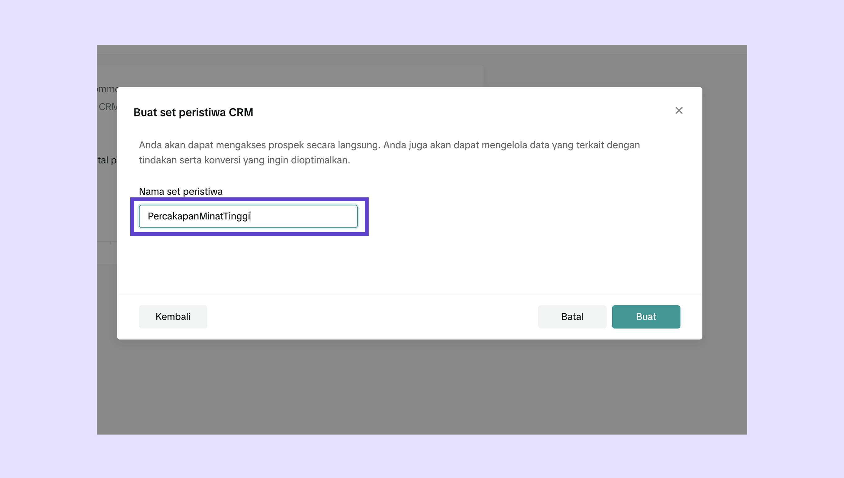 Masukkan nama Set peristiwa (Set event) → klik Buat .