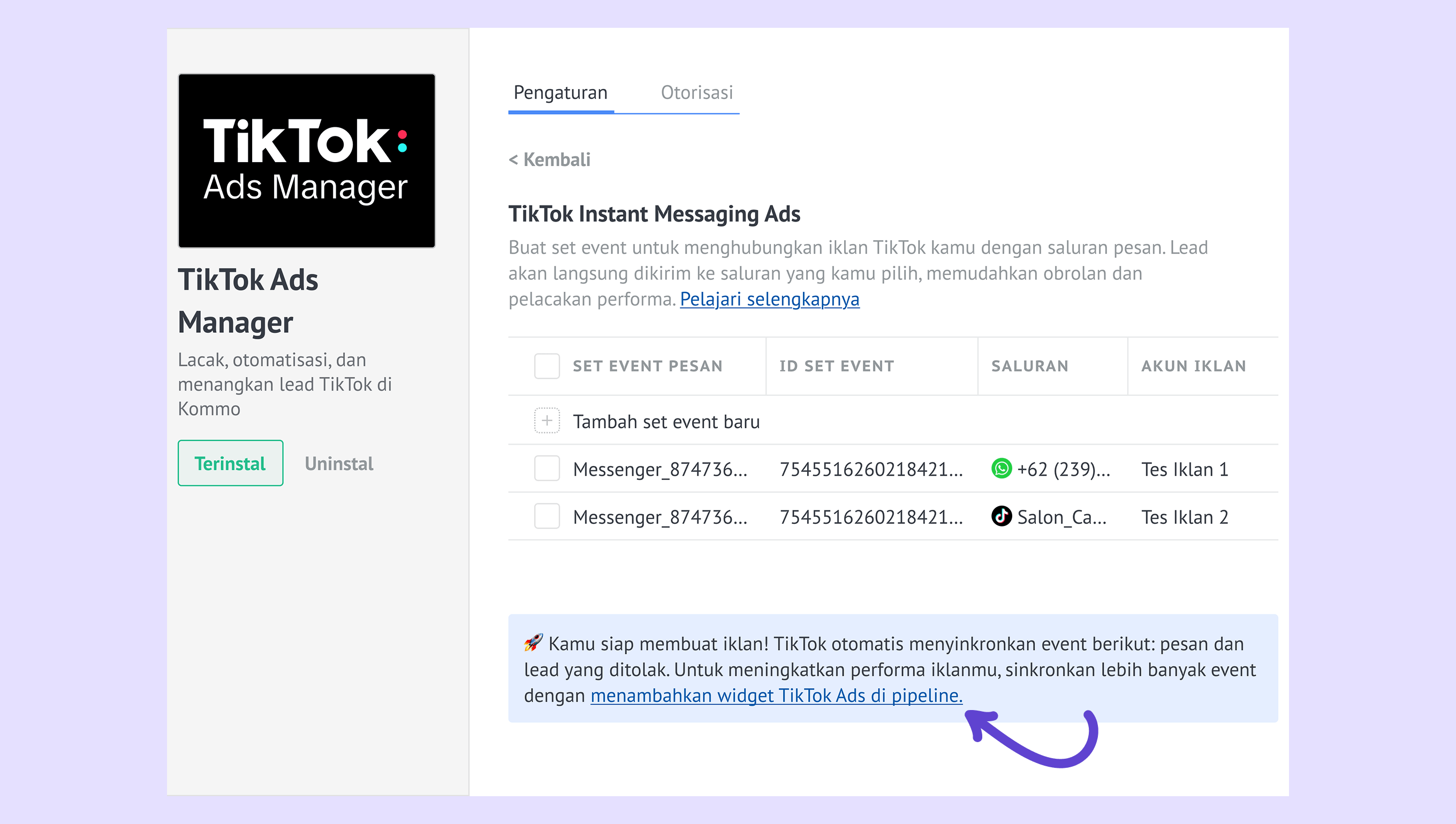 Di Kommo, buka integrasi TikTok Ads Manager , lalu klik tautan di bagian bawah widget untuk membuka pipeline utama .
