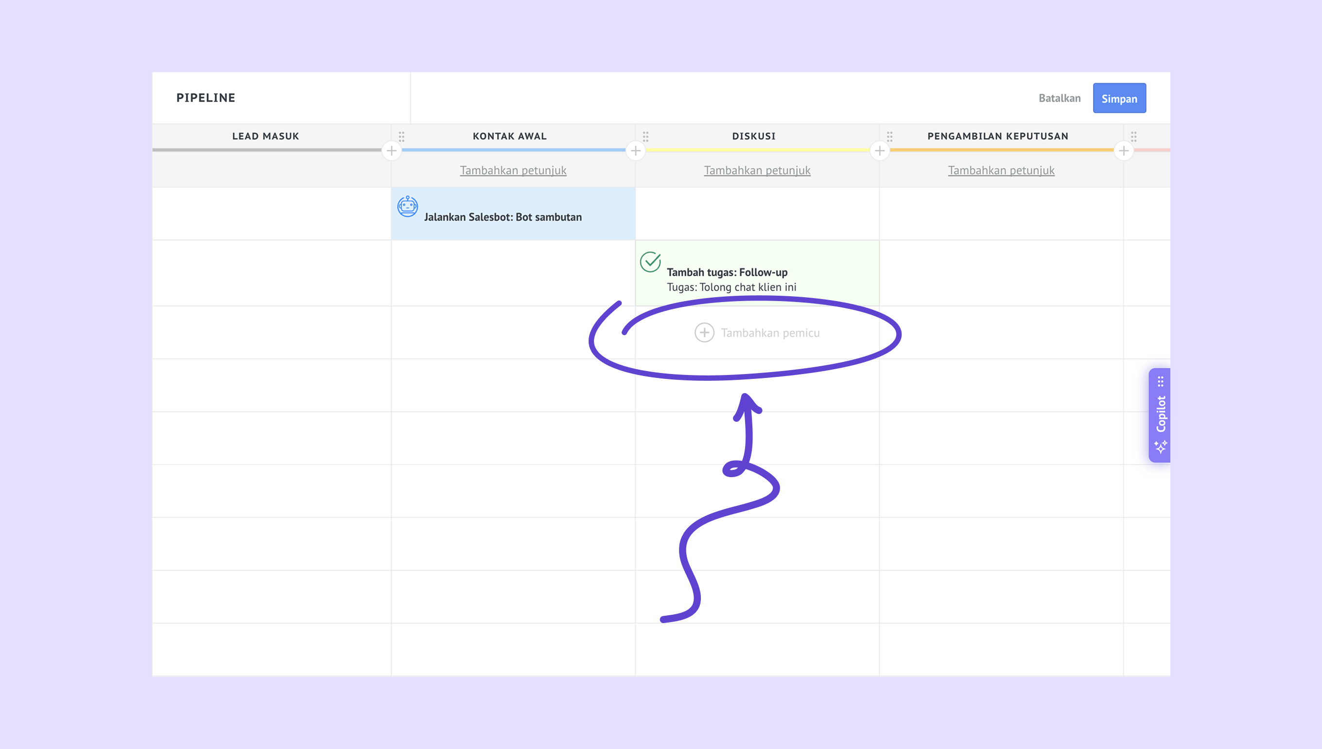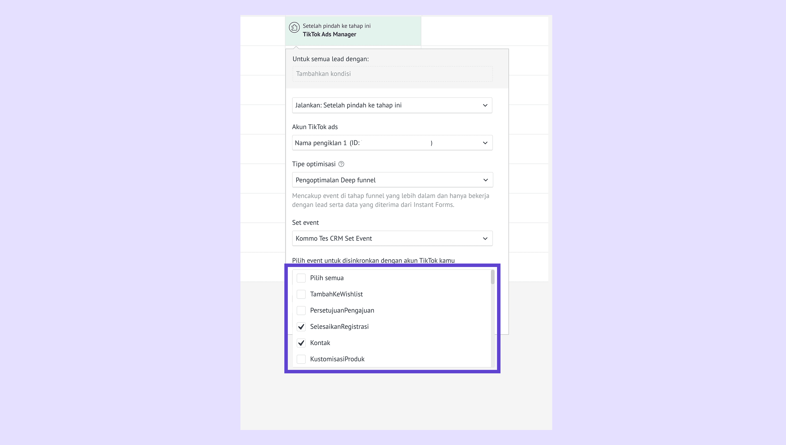 Pindahkan lead yang ditangkap dari Formulir Instan TikTok ke tahap pipeline tempat pemicu Pengoptimalan Deep Funnel dikonfigurasi. -