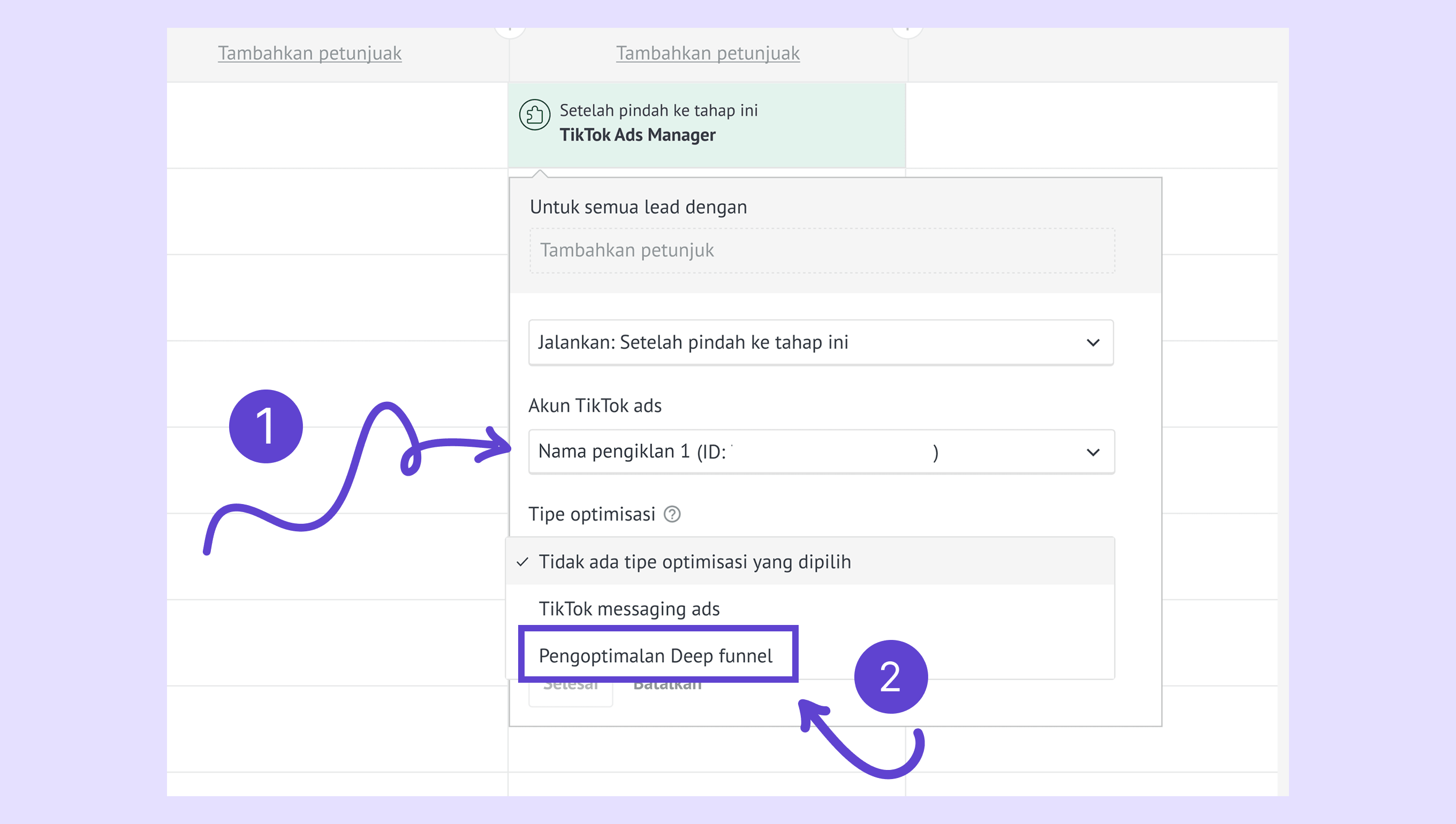 Pilih Akun Tiktok ads → Tipe optimisasi —> Pengoptimalan Deep funnel .