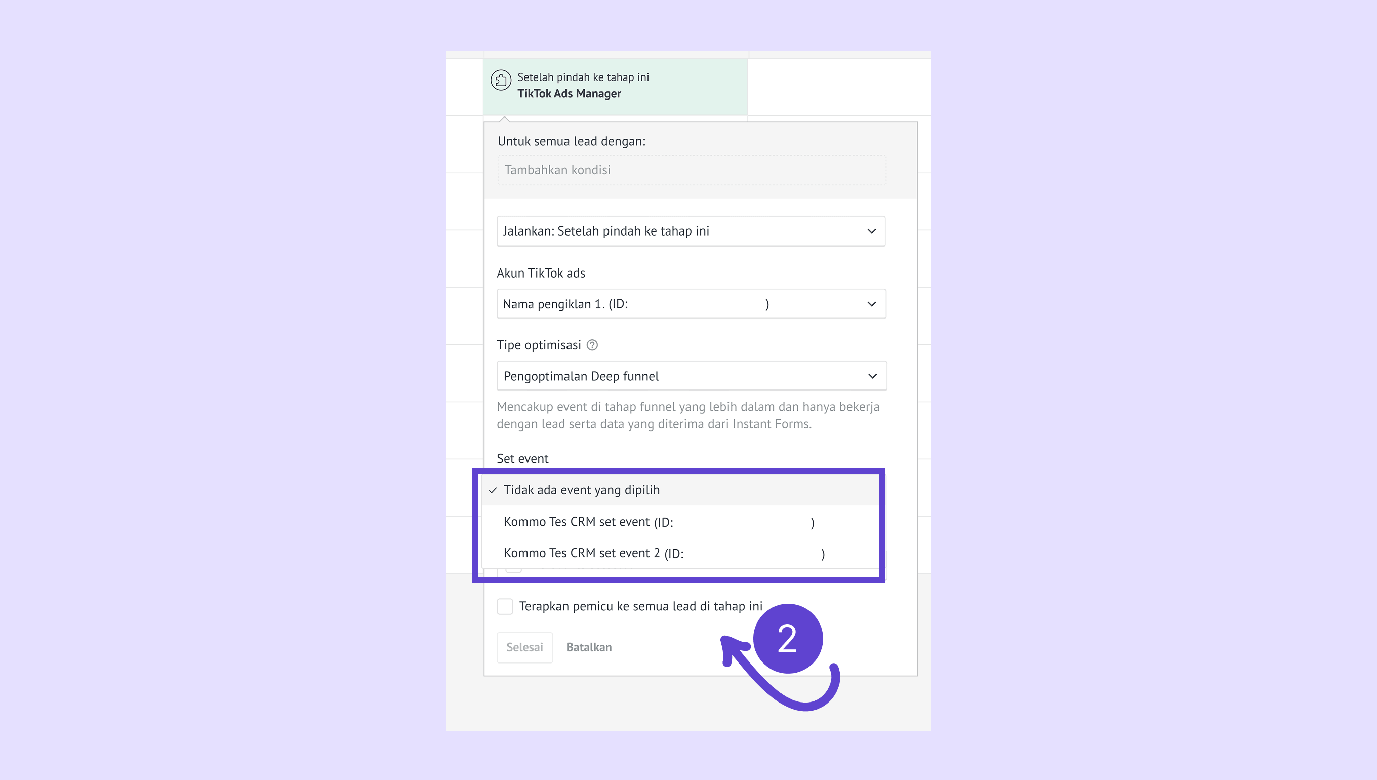Pilih satu atau beberapa event untuk lead yang dipindahkan ke tahap pipeline yang dipilih dalam pemicu. Event ini akan dikirim ke Analitik TikTok.