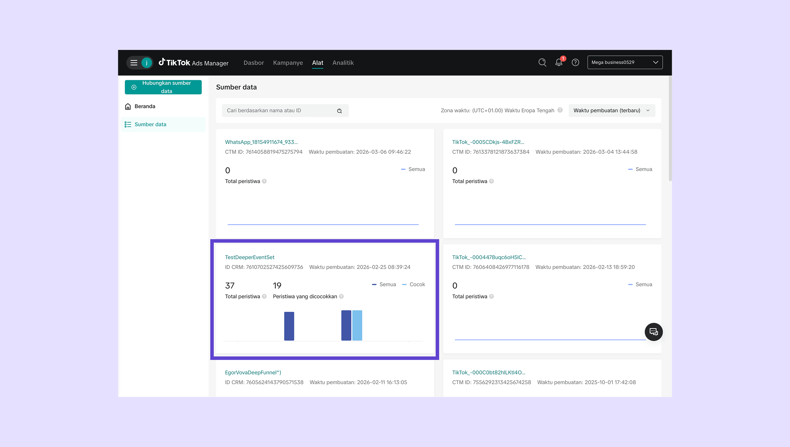 Buka TikTok Ads → Alat → Events Manager → Sumber Data . Event yang dikirim berdasarkan lead ini akan muncul di halaman tersebut.