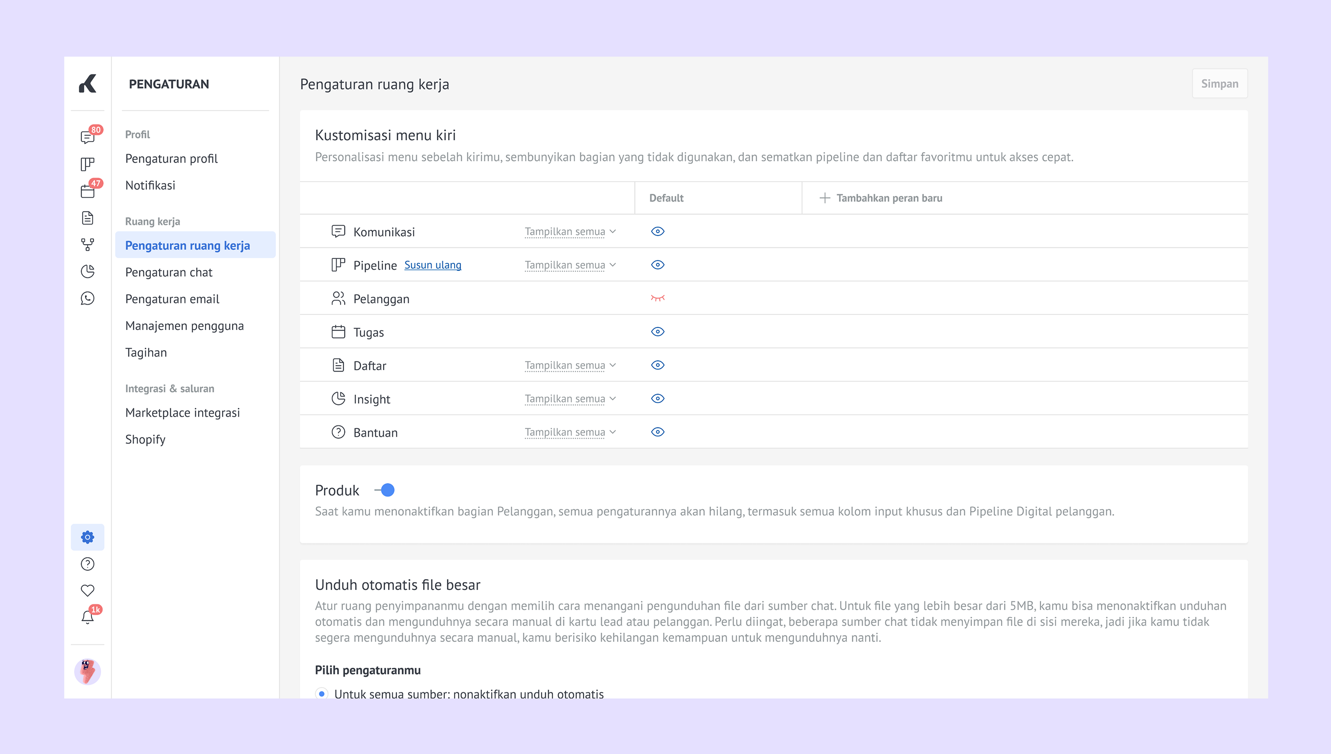 Pengaturan ruang kerja (sebelumnya Pengaturan umum) – sesuaikan ruang kerja agar sesuai kebutuhan timmu. -
