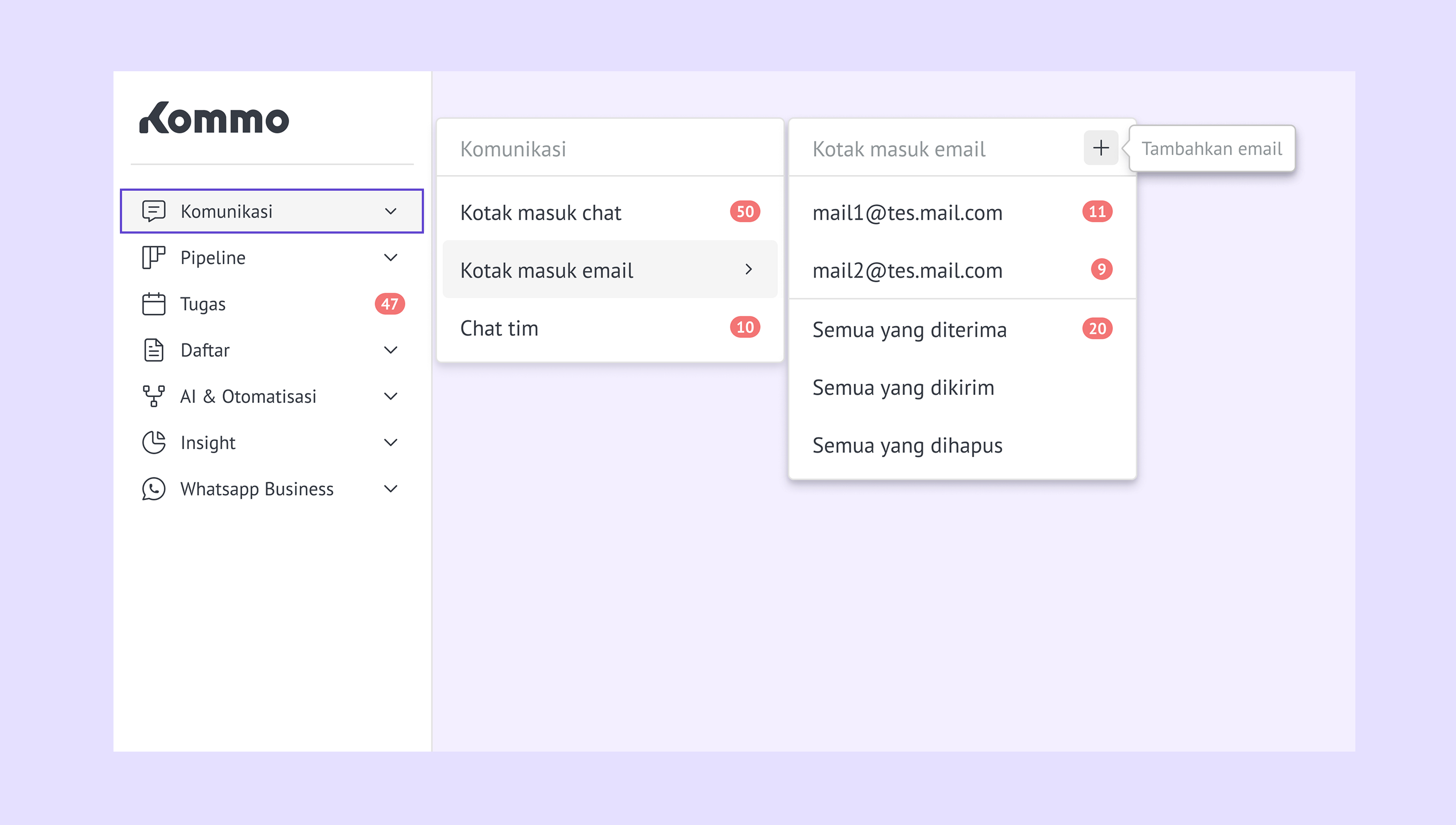 Pengaturan email – atur dan kelola sinkronisasi email dengan akun Kommo. -