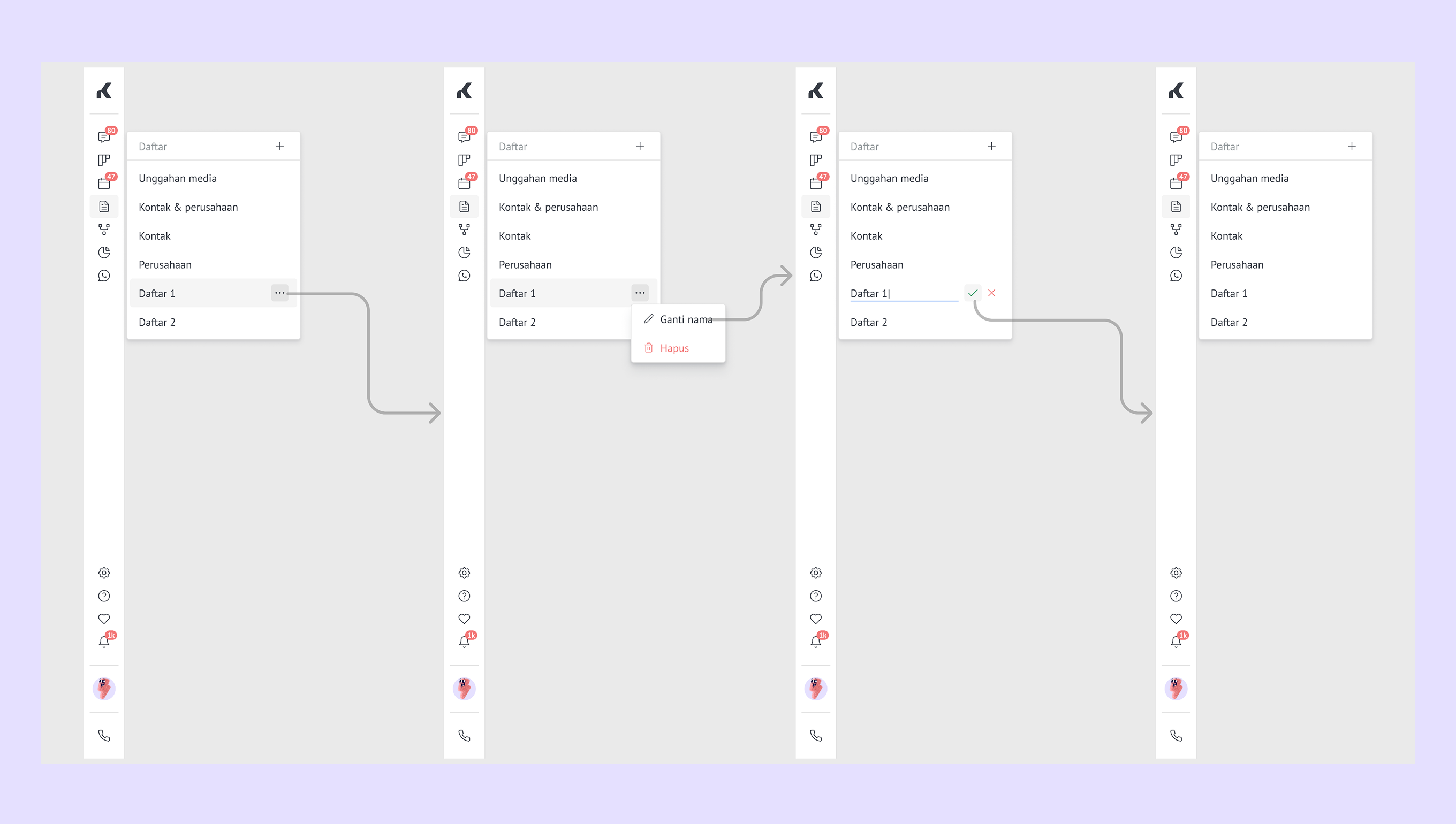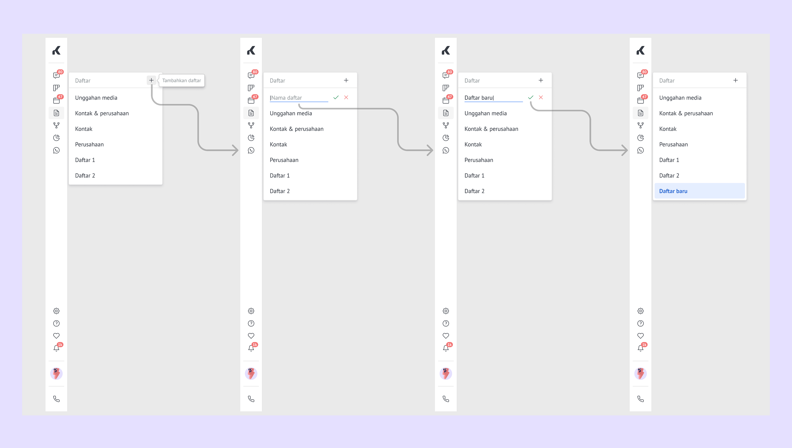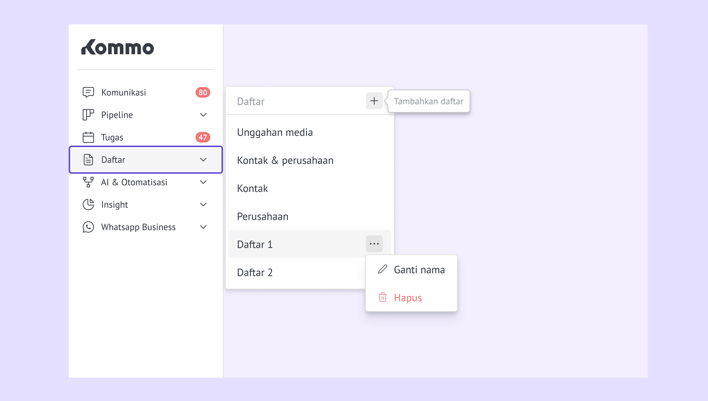 Tambah daftar baru – klik ikon + , pilih jenis daftar yang kamu inginkan, lalu beri nama.