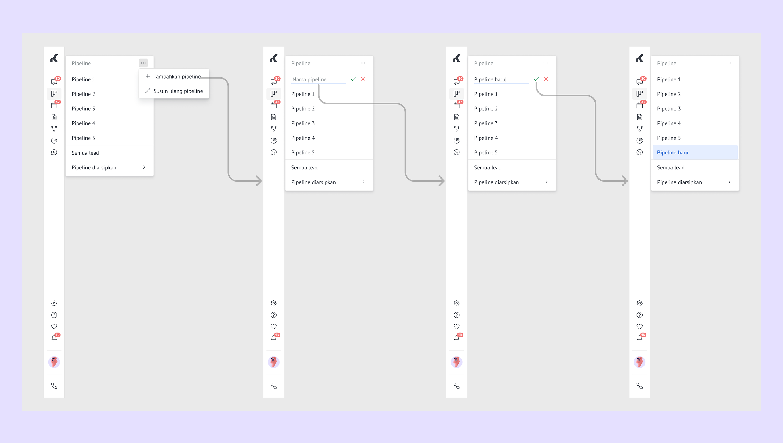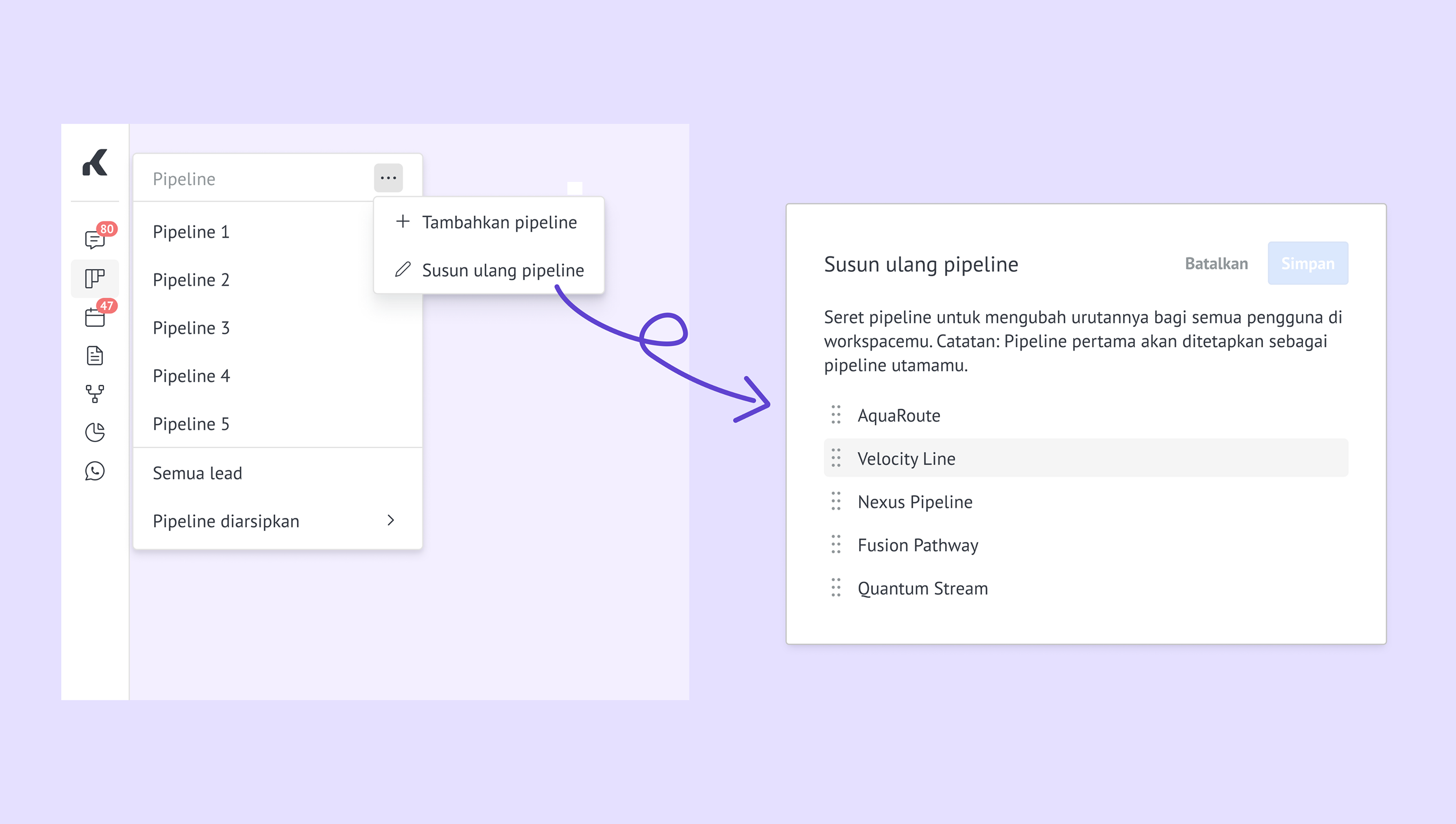 Beralih cepat – pindah antar pipeline seketika dengan mengarahkan kursor ke daftar pipeline. -